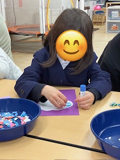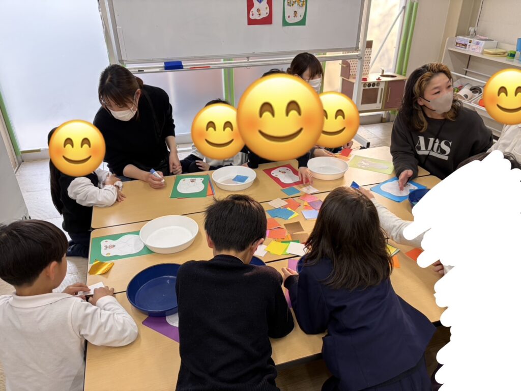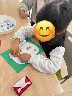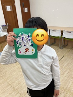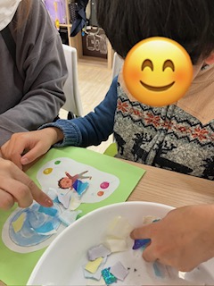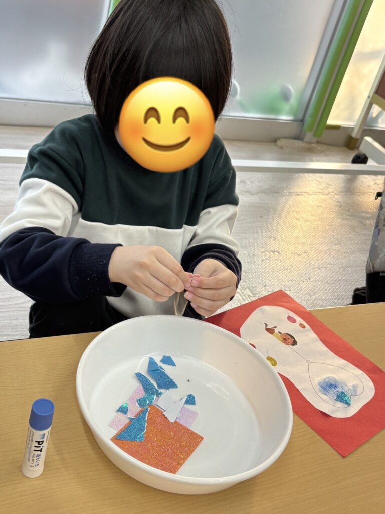 この活動では、紙を「ちぎる」、のりで「貼る」ことを通して、手先の巧緻性の向上を目指します。絵の枠を意識して紙を貼ったり、紙をちぎって形を整えたり、楽しい活動の中に、成長に繋がる動きがたくさんあります😊好きな色・好きな貼り方で、表現することの楽しさを味わってほしいという思いもありました🥰