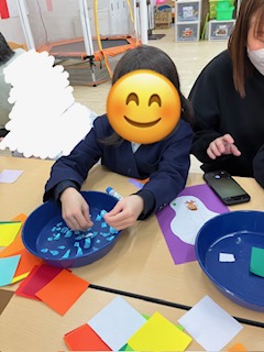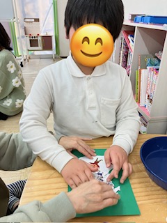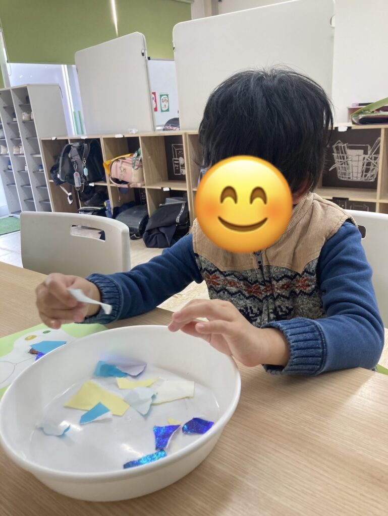 まず好きな色紙を3枚選んでもらい、小さくちぎっていきます。なるべく小さくちぎるようにがんばってみよう!と声をかけました😊