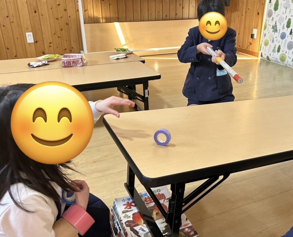 また、穴の開いた物を転がして動きに合わせて棒ですくい取る遊びもしました!