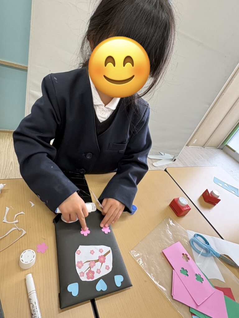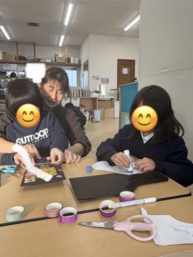 羽子板では、好きなキャラクターを子ども達がカットし、糊で貼りつけハートや花で飾りつけしたり、