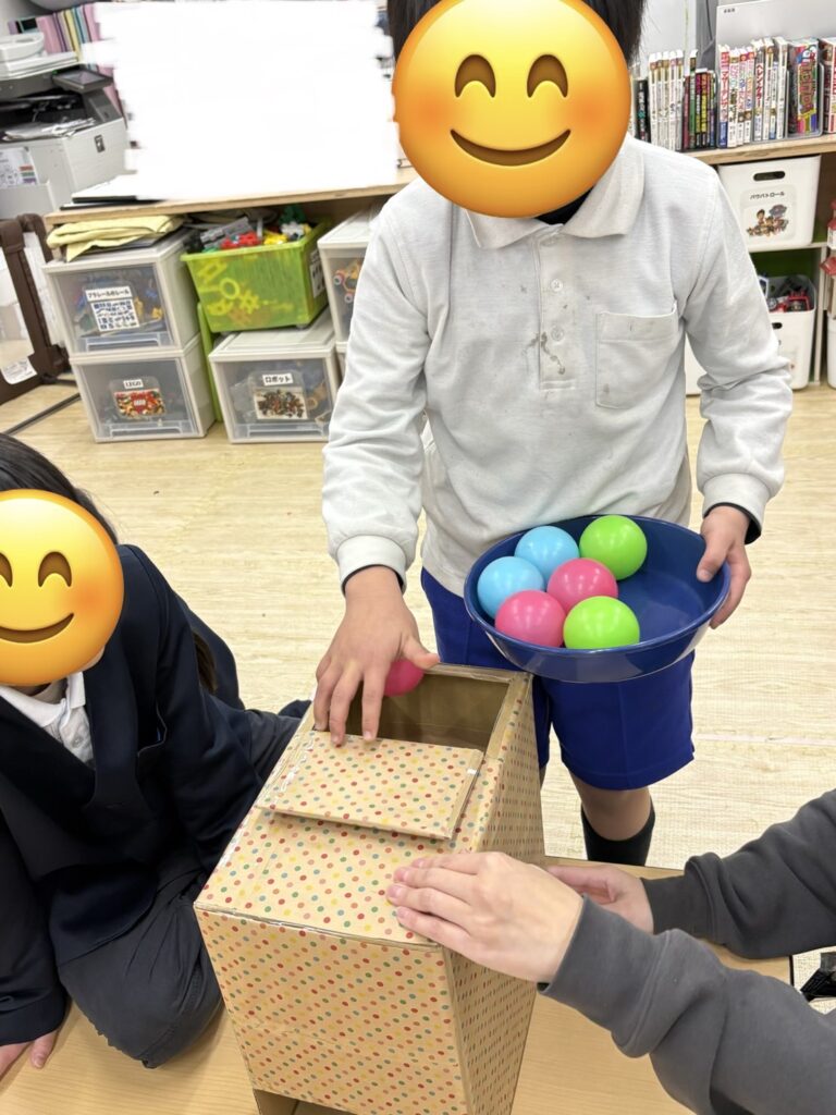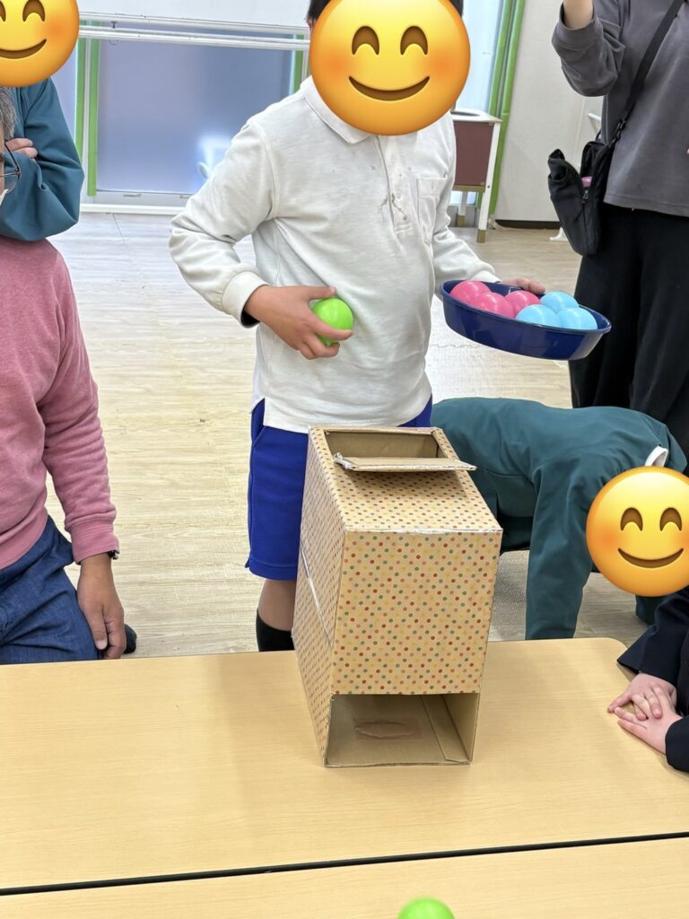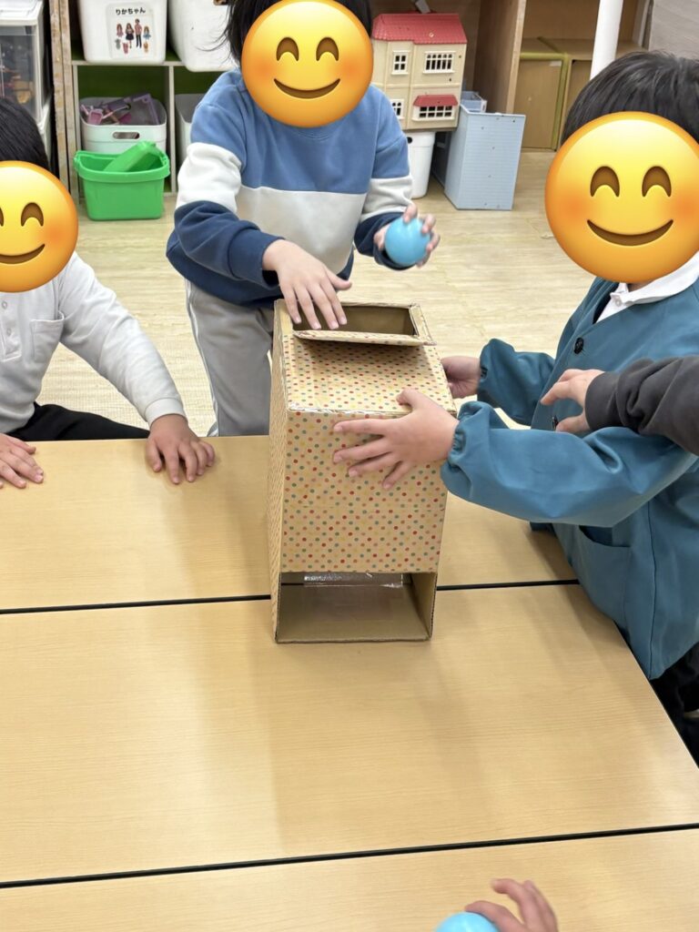 愛情たっぷり💕手作りのボックスからそれぞれのカラーボールを転がし、その転がってくるボールの色を見て同じ色の箱の中に入れていくゲームです♪