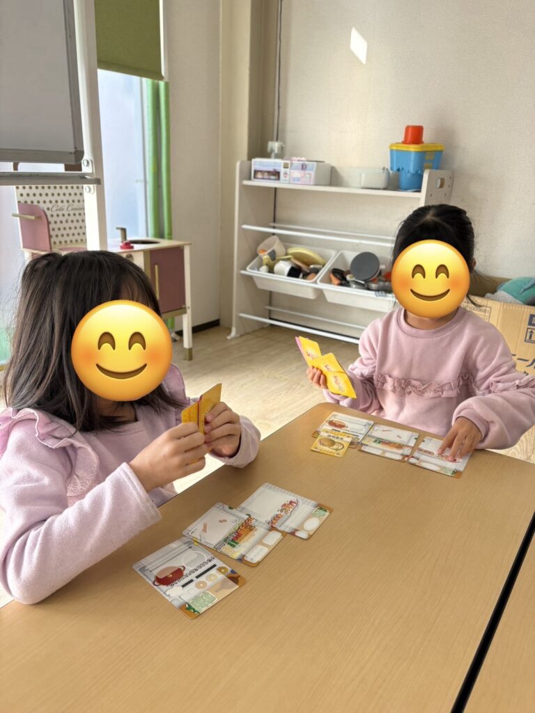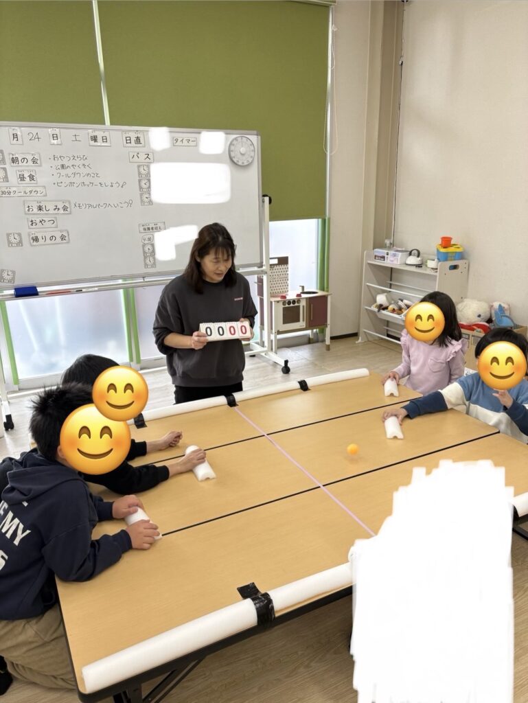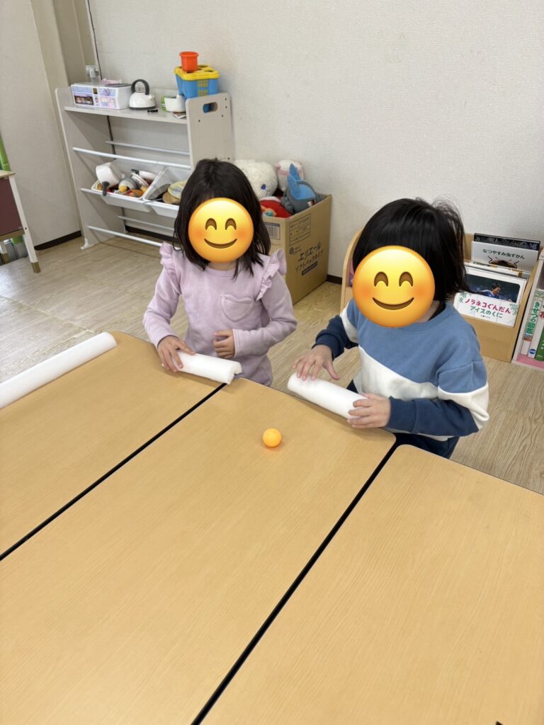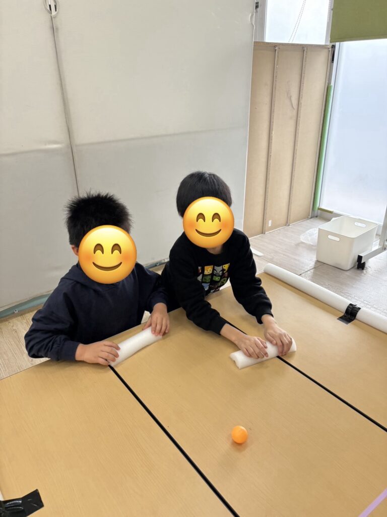 朝の会ではおやつ選び・午後からの公園遊びでのお約束の確認・ピンポンホッケーゲームを行います😊ピンポンホッケーゲームはピンポン玉が軽いので、力加減を調節しながら2人組で協力して楽しく行います🏓