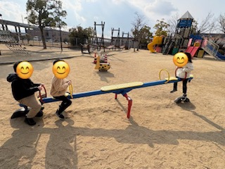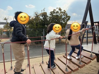 ターザンロープ、シーソー、滑り台、釣り縄橋、タイヤのブランコで仲良く遊んでいます😊