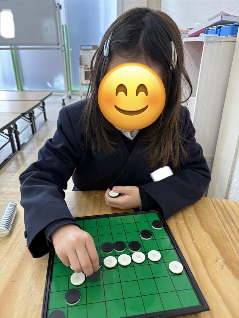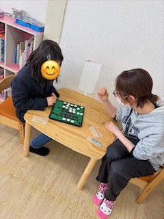 見立てて作成している子、人生ゲーム、おままごと、知恵の輪やスタッフとオセロ、