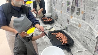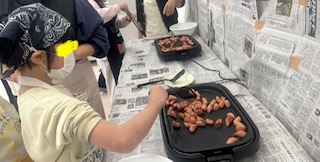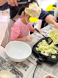 次はホットプレートでウインナーをやキャベツを炒めます。自分の順番までホットプレートから離れて様子を見ることが出来ました👏