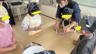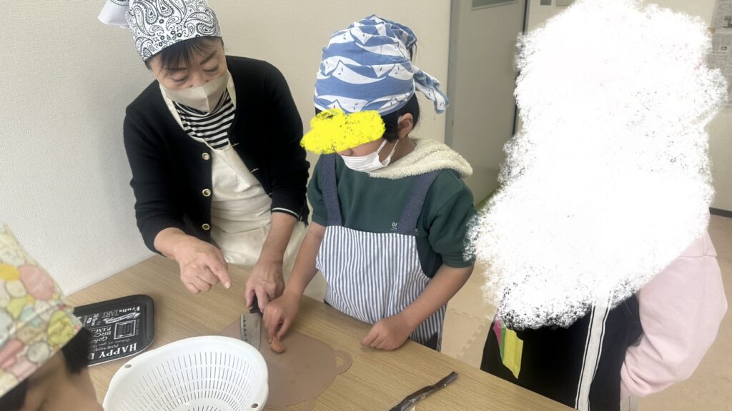 さて、クッキング開始!今回は刃先がセラミックの包丁と大人用の包丁を使いました。手を切らないように、人に刃を向けないように気をつけながらウインナーを切ります。他のお友だちが切っている様子をよく見て順番になった時には慎重に使っていましたよ😊
