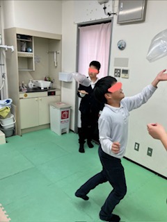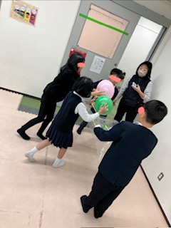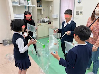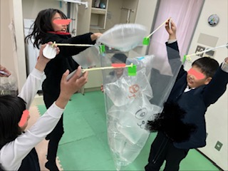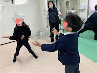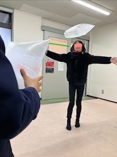 その後は二人で大きな袋を持ち他のお友だちに袋を入れられないように袋を動かします。