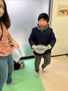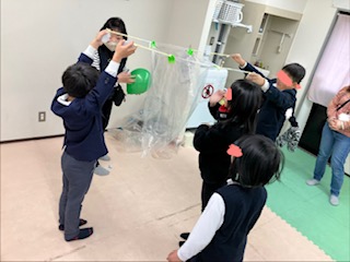 最後は風船の登場です!1分の間に風船を入れます。袋を持ったお友だちはスタッフが合図すると5秒間袋を閉じます。袋の閉じ方もお友だち同士で工夫していました😊他のお友だちは風船を持ちタイミングをよく見て袋に入れましたよ🎈