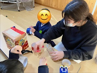先程のクイズで豆まきの時の掛け声を練習していたので、みんなで「鬼は~外、福は~内‼️」とみんなで言いながら玉入れをしていましたよ!