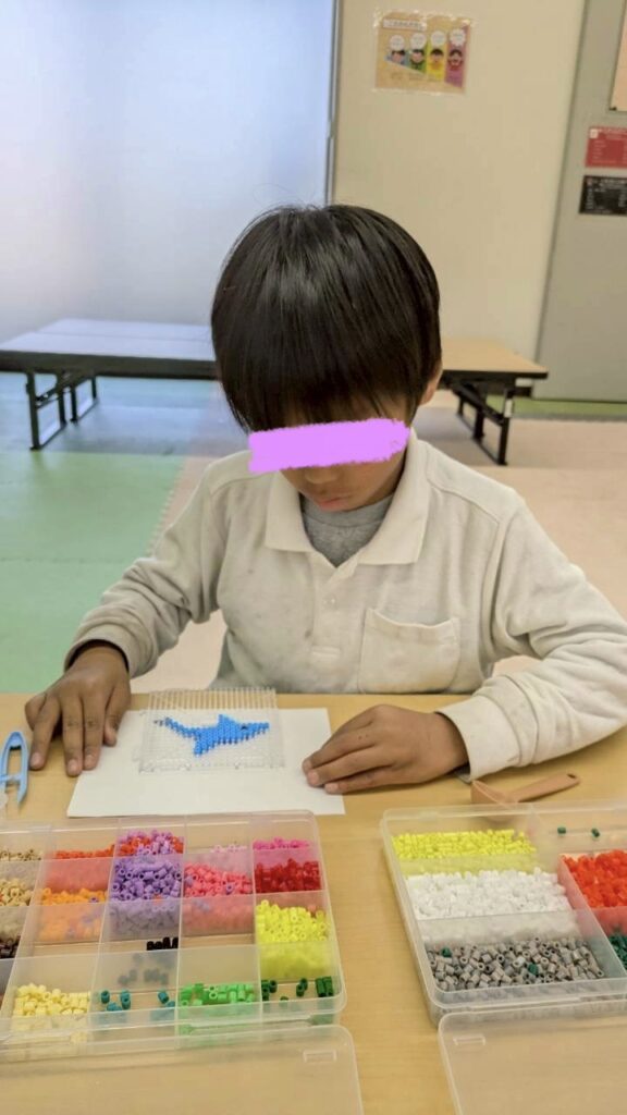 自由遊びでは、この日久しぶりに来所したお友だちが、アイロンビーズを集中して行う姿が印象的でした👏