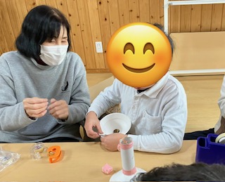 ハサミで切り込むサイズが難しい所や、輪ゴムのくくり方で苦戦するところは、スタッフに聞いて手伝ってもらいながら、上手に作っていましたよ💖