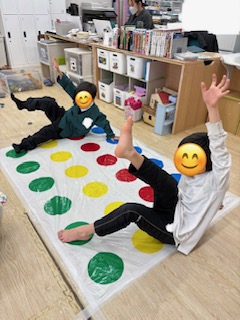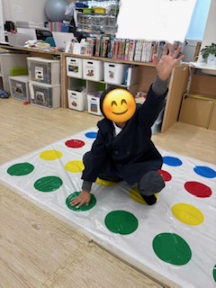 ルーレットの指示に従い、青・赤・黄・緑の丸に手や足を置きます✨上手にバランスを取りながら、楽しく取り組みましたよ😊