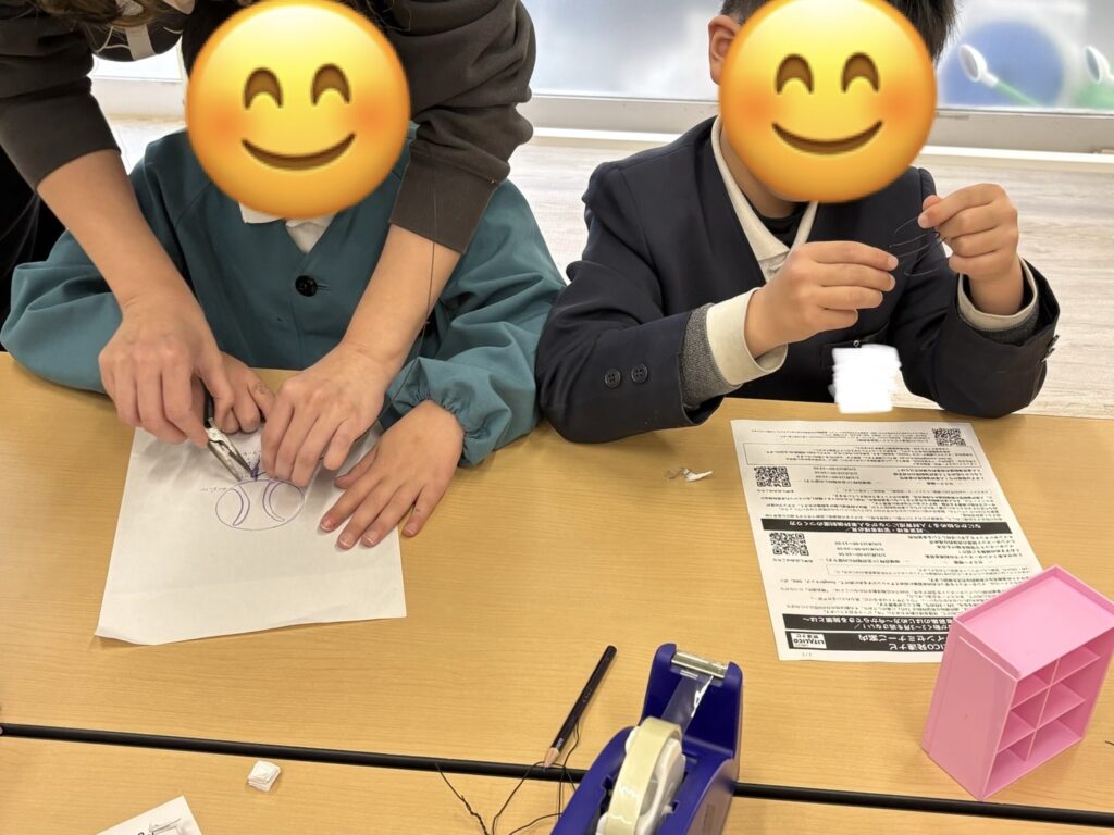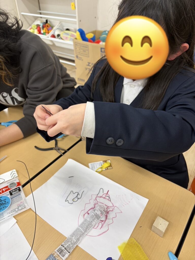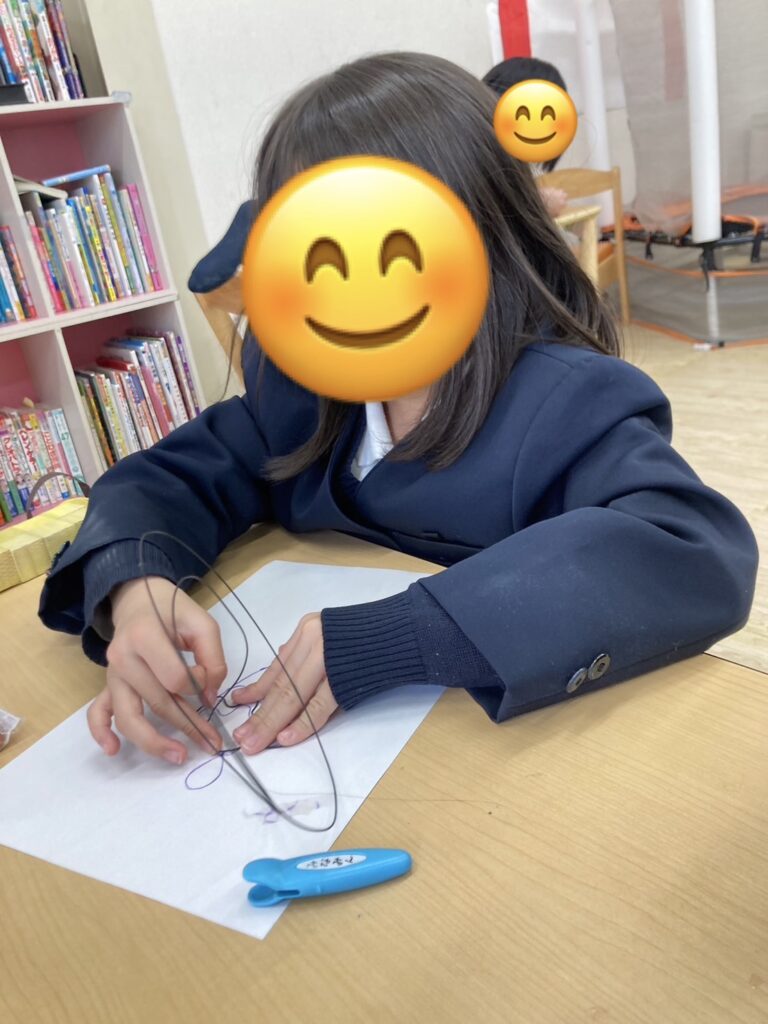 イラストの上をなぞるようにワイヤーを曲げ、形を作ります!指先を使いながら、集中して取り組む子ども達✨可愛い猫やイチゴなど出来上がっていましたよ🍓