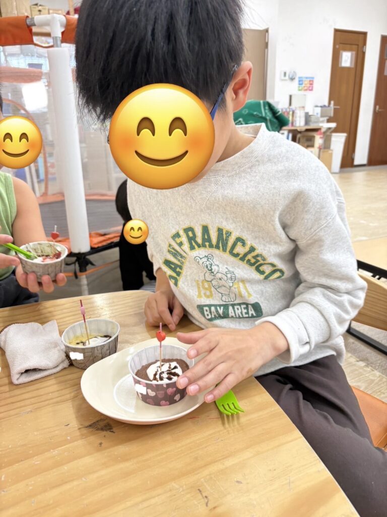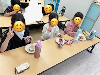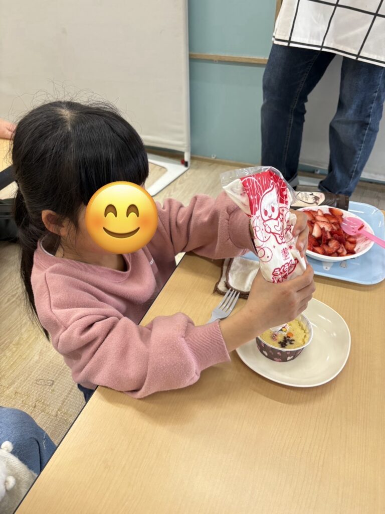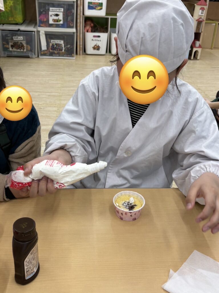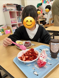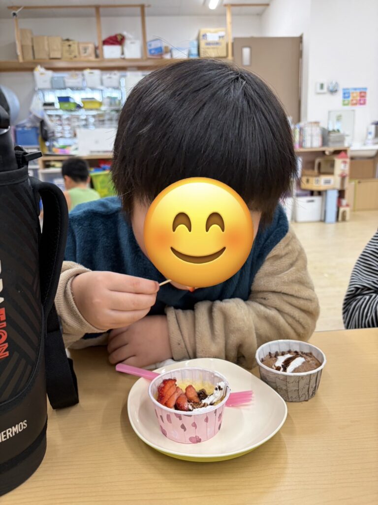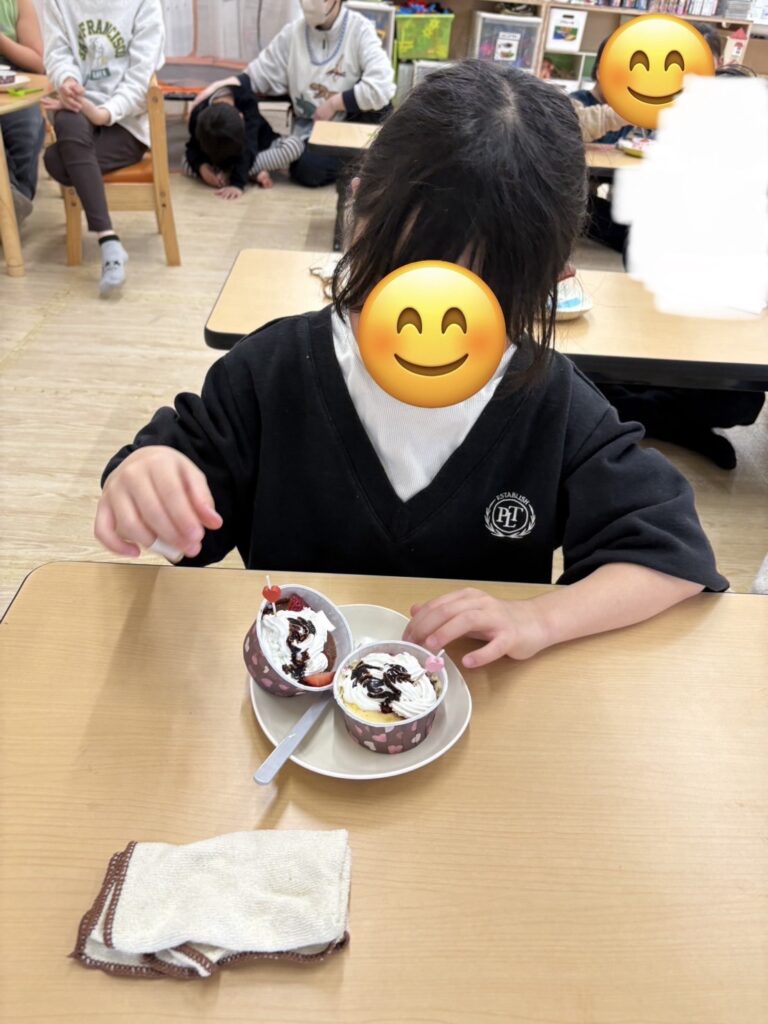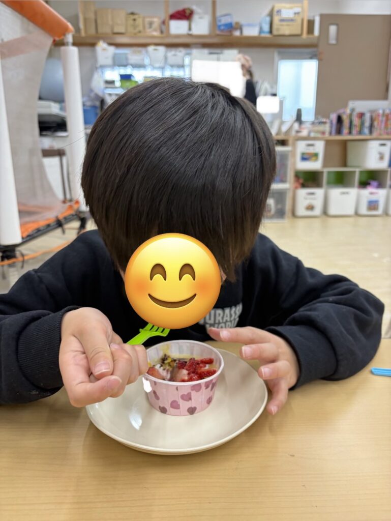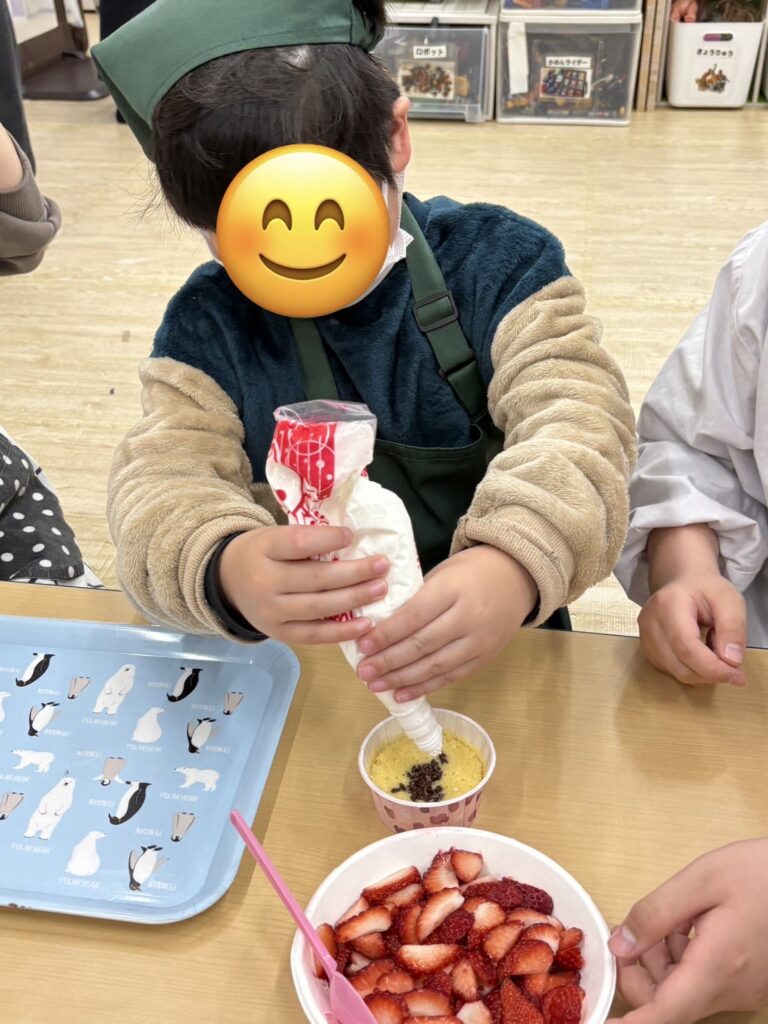 完成したらホイップクリームやいちご🍓をトッピングして美味しそうに食べていました~😋!
