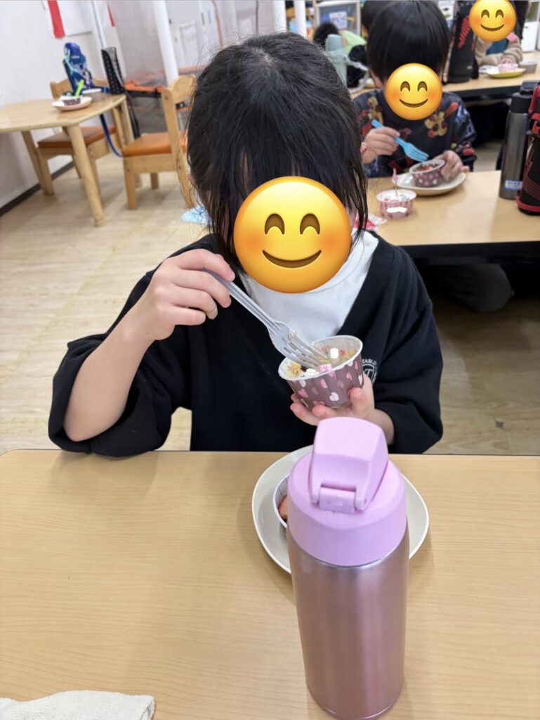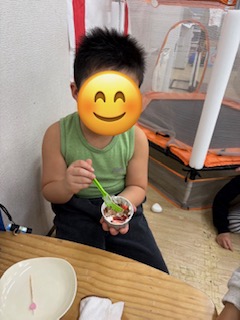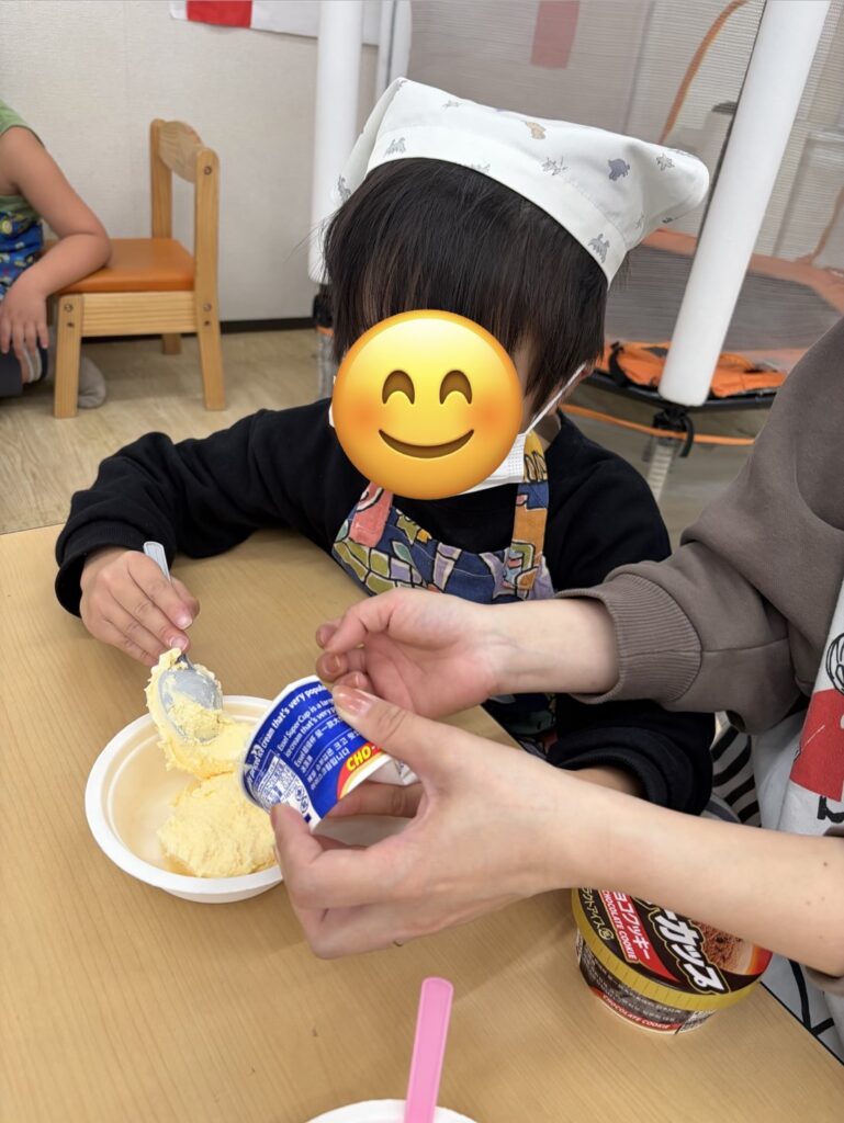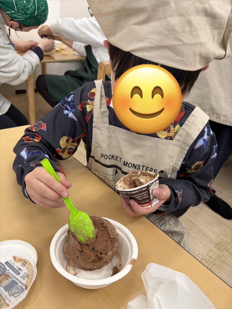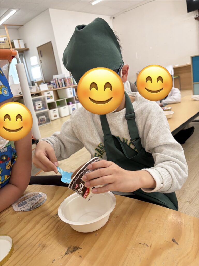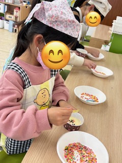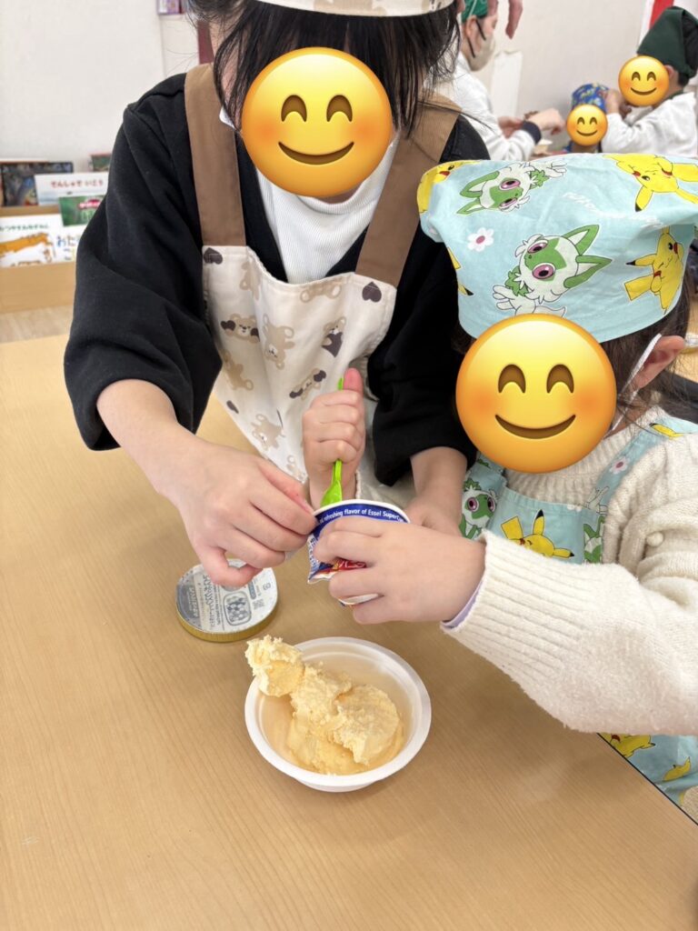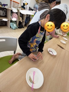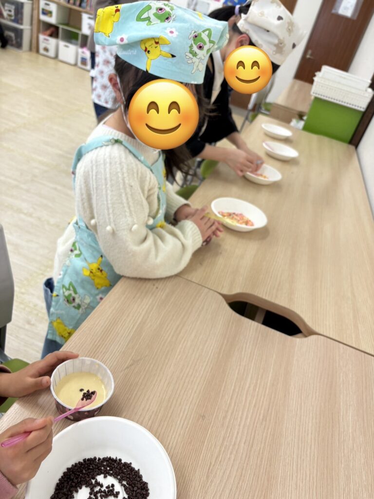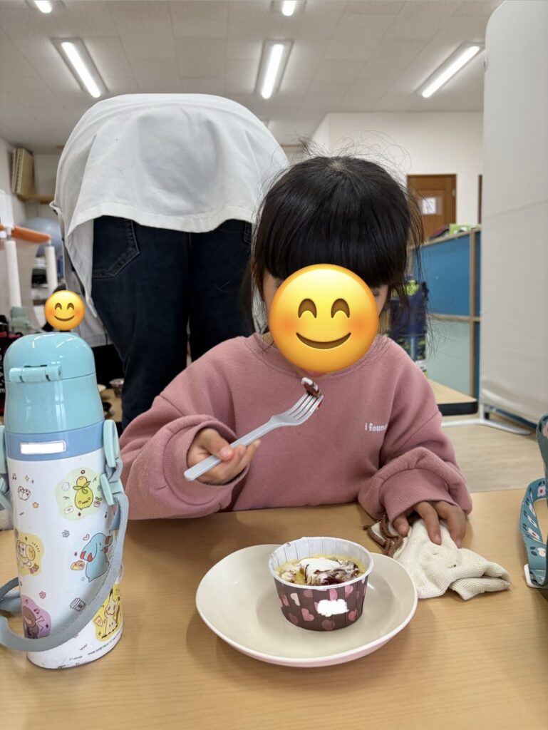 完成したらホイップクリームやいちご🍓をトッピングして美味しそうに食べていました~😋!