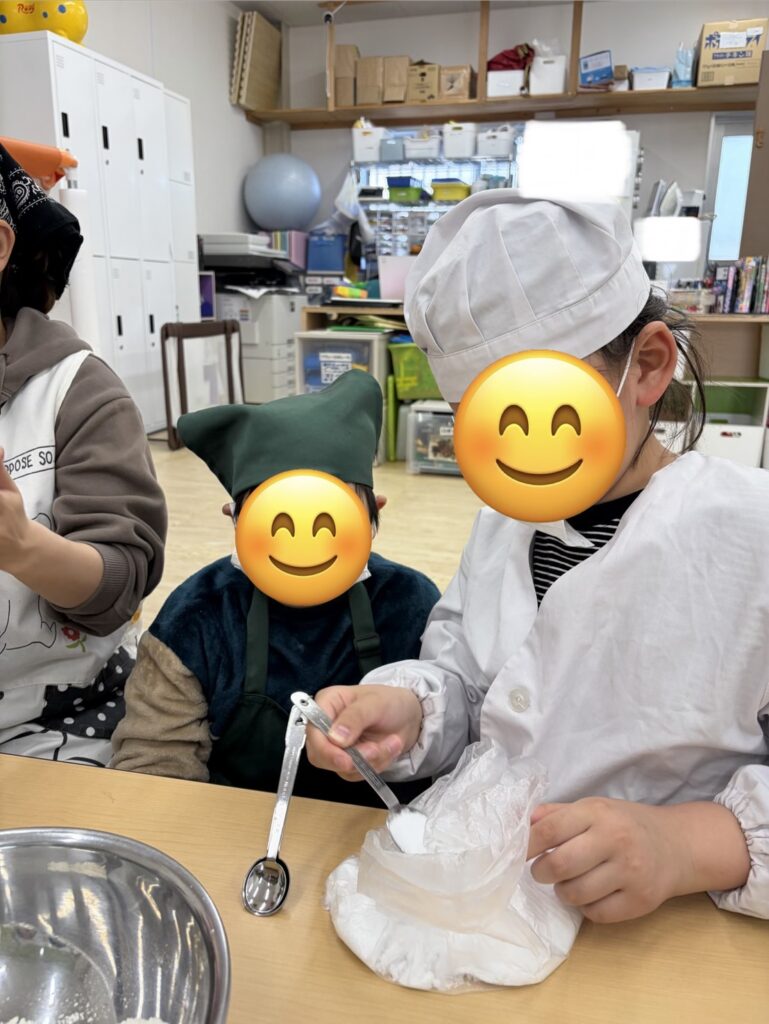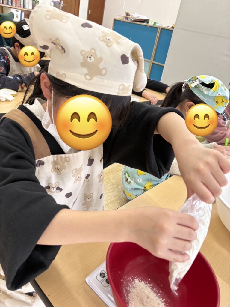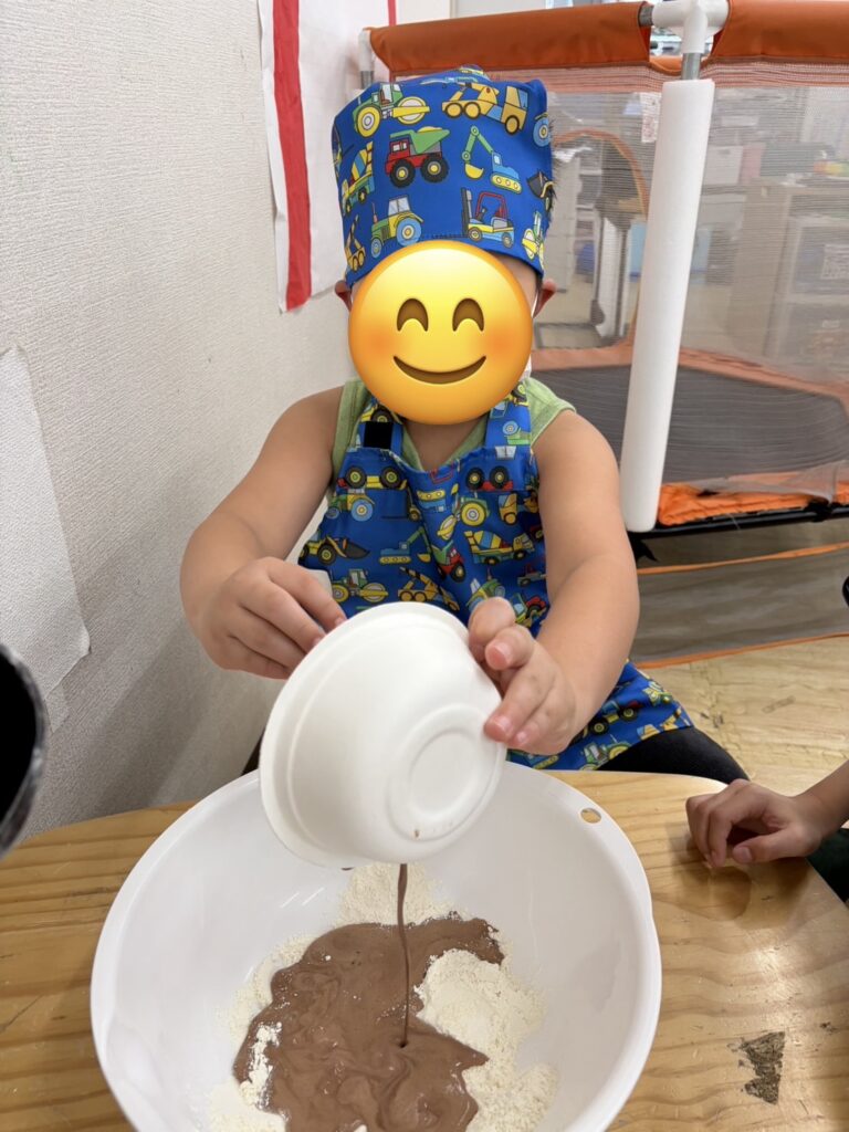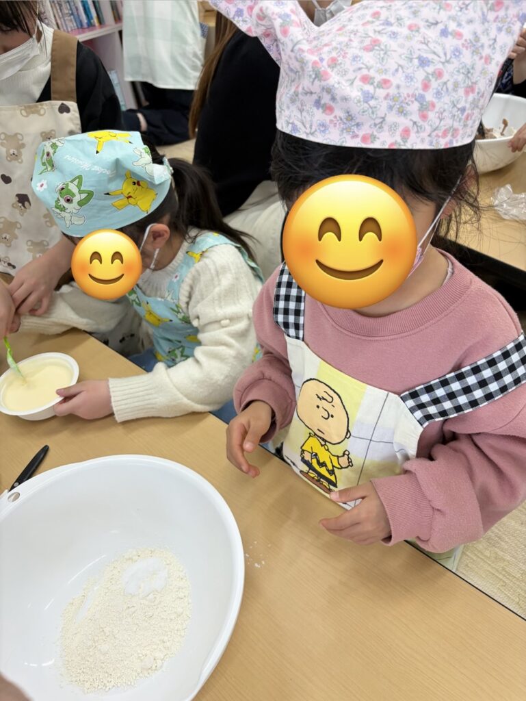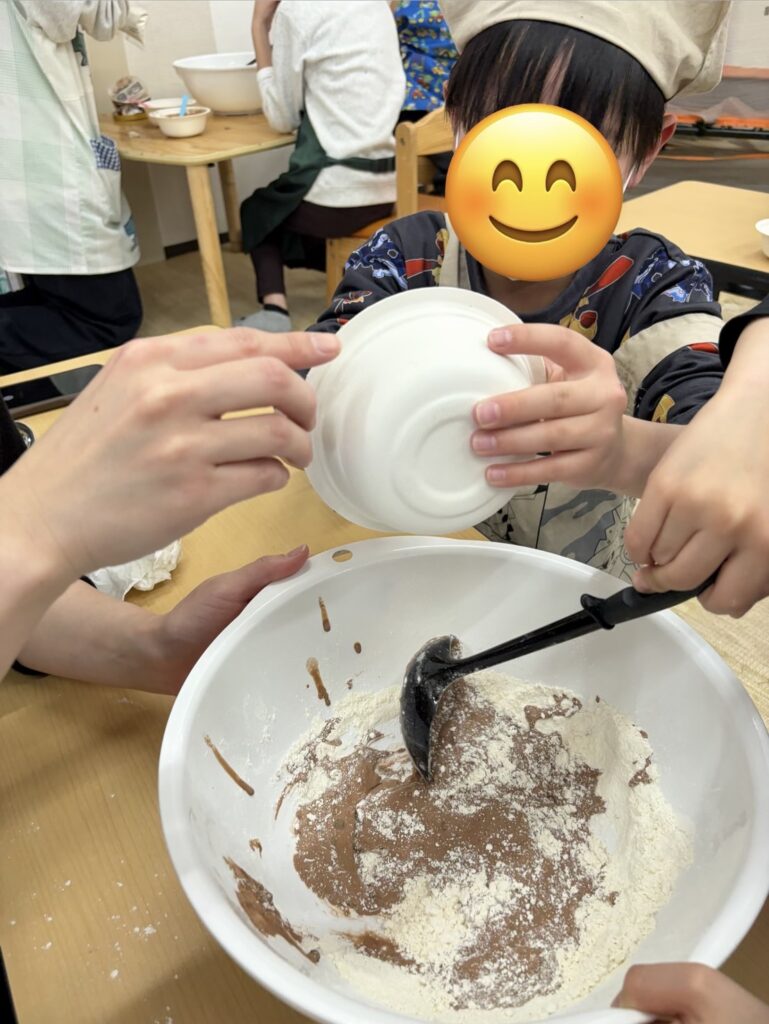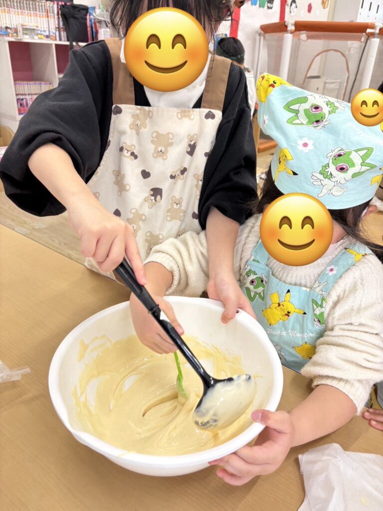 型に生地を流し入れた後、それぞれが「どうしよっかな~?」と悩みながら