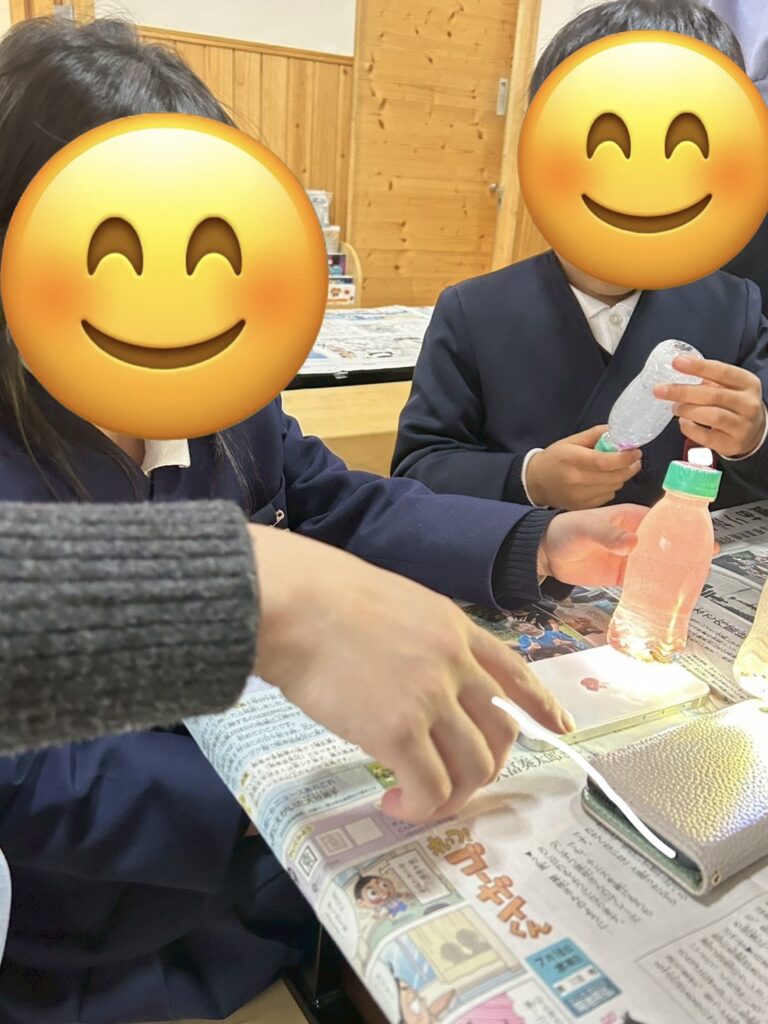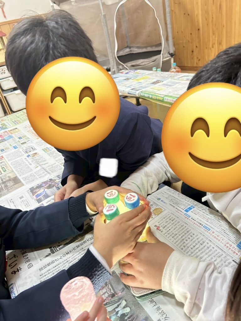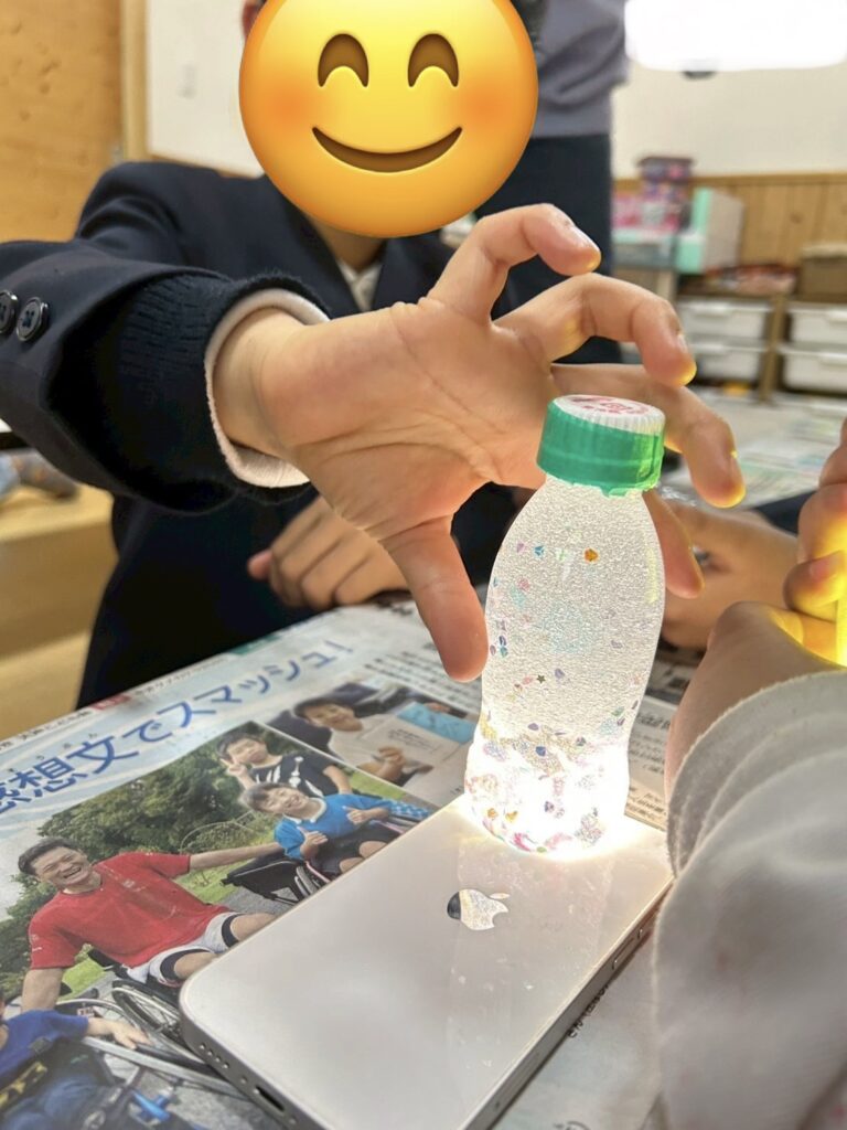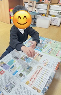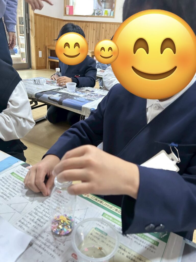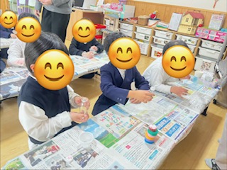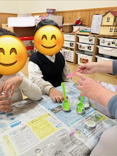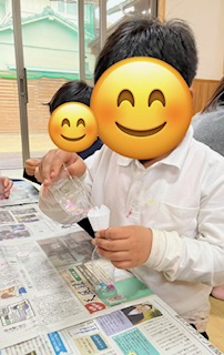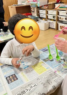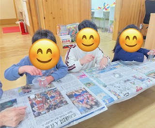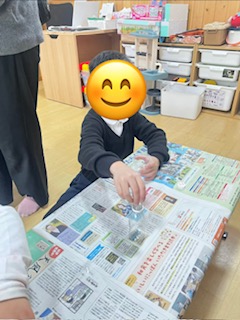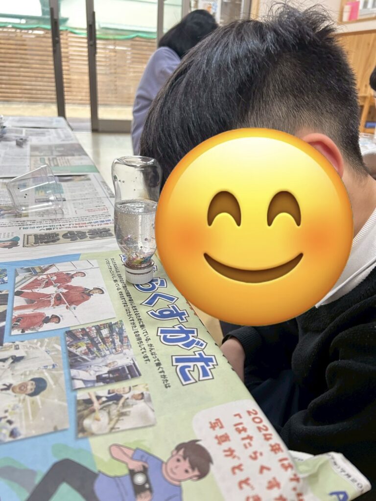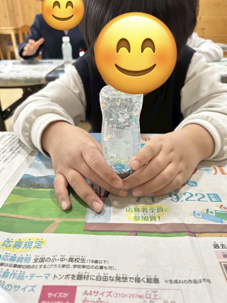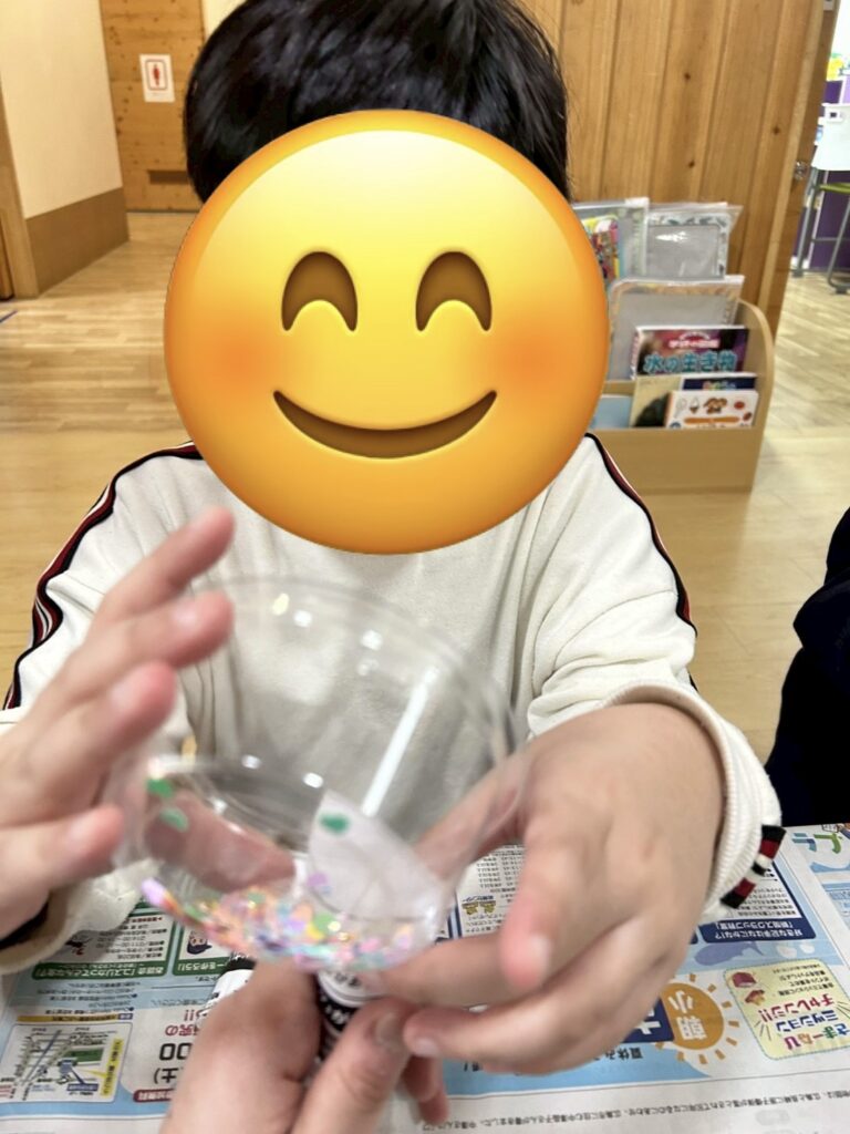 紙をじょうごの形にするのがなかなか難しかったですが、お友だちと手伝い合いながら頑張ったり、落ちたラメを拾ってあげたりと協力する姿が見られましたよ😊