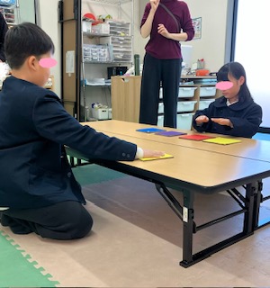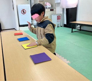 4色のカードを前に、言われた色以外のカードへ手を置くというものです(*^▽^*)