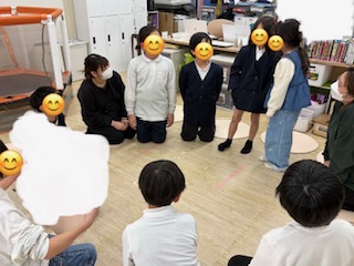 まずは円になり、その中で鬼を2人決め、鬼は聞こえないよう違う場所に移動します。その間にリーダー1人をくじで決めます!(^^)!