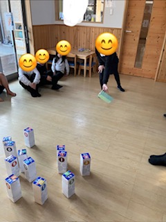 モルックを真似して遊んでみましたよ(^^)/ 倒した点数つきの的の、合計点数の数え方が、少し難しいですが、写真で確認して、視覚支援の学びを行い、理解を深めてもらいましたよ⭐