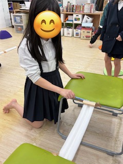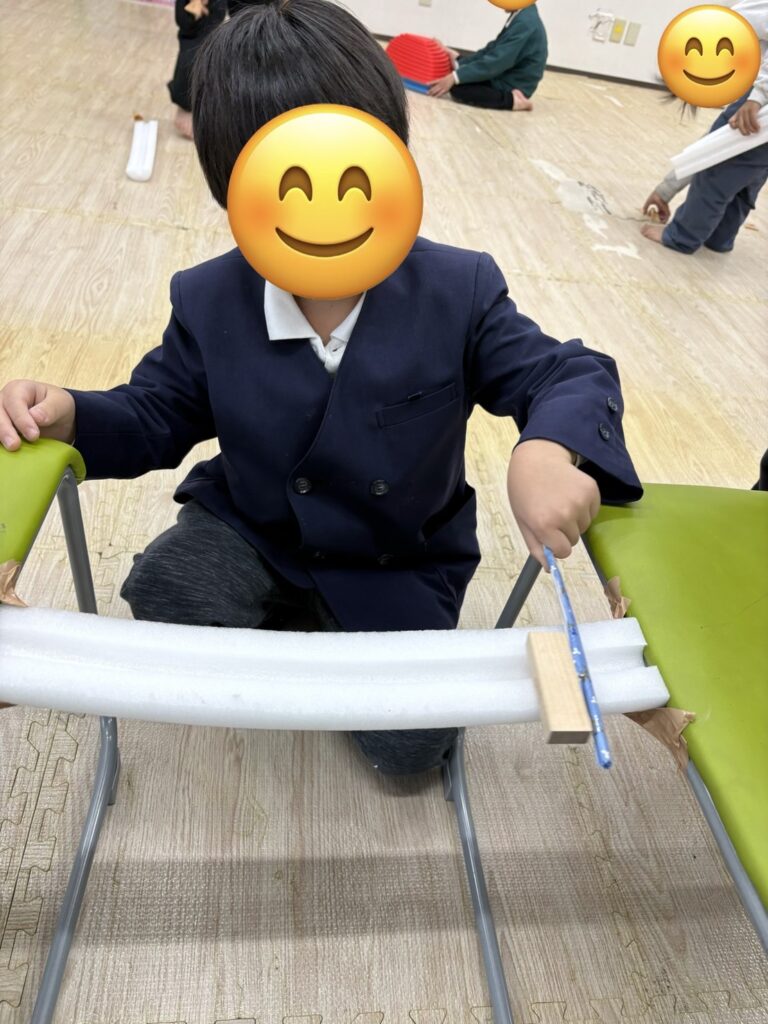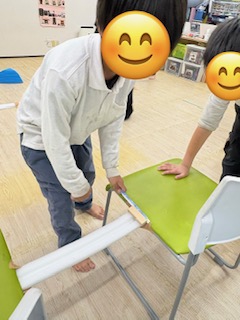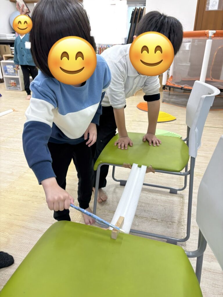 ⑤ブロック運び…椅子と椅子の間に橋を作り、その橋にブロックを運びます。落ちないように「ゆっくり」「あわてずに」運ぶことで見る力と動かす力を養います。