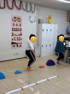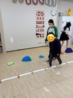 ①バランスストーン…ストーンの上を落ちないように歩くことで体幹やバランス感覚を育てます。