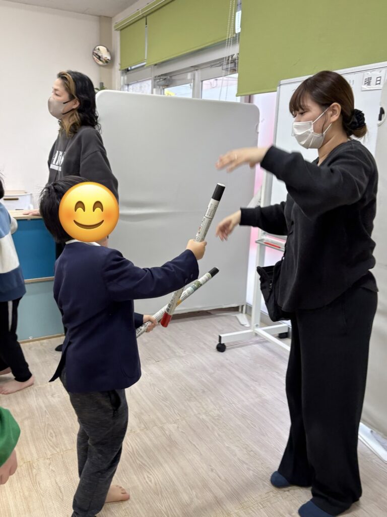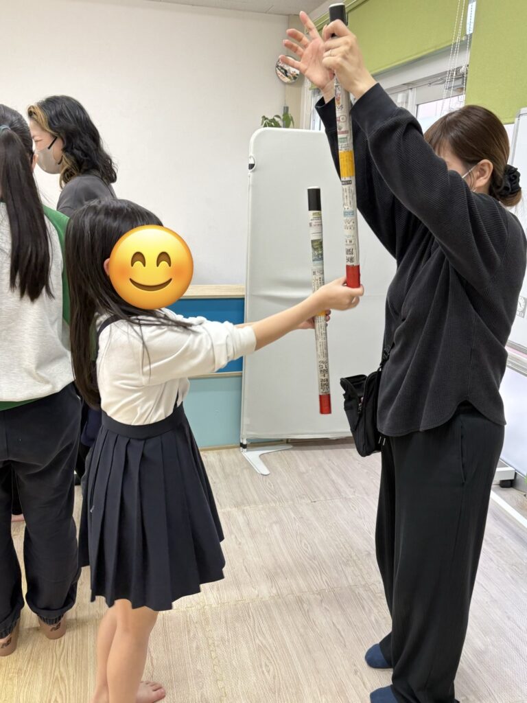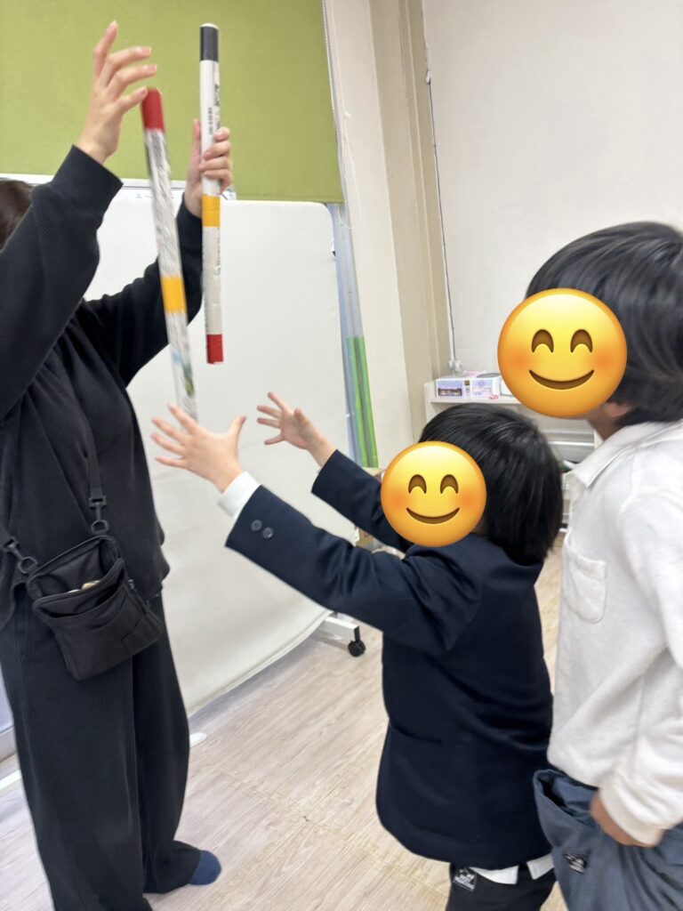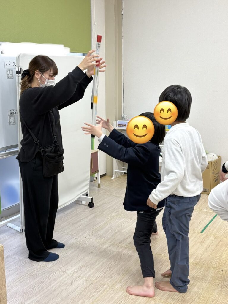 まずはスタッフがお手本です!意外とコグトレ棒キャッチ難しい〜☹️