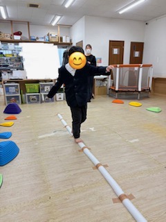 ②スポンジ平均台…真っ直ぐ歩けるよう、ゆっくり一歩ずつ進みます。真っ直ぐ歩くことで体をコントロールする力がつきます。