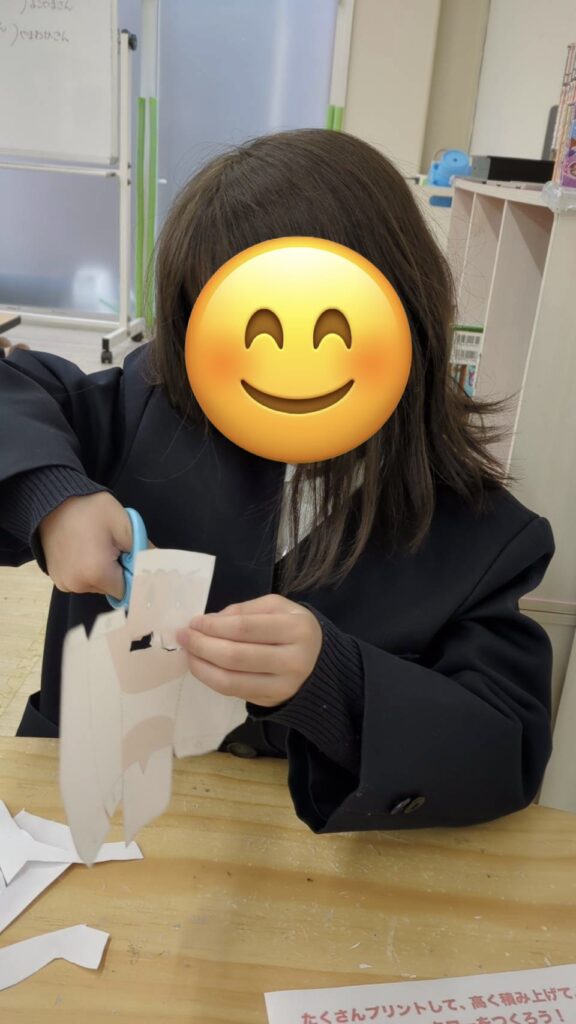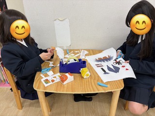 お友達と「ここは、こうするんだよ」と相談したり、教え合いながらペーパークラフトを楽しんでいました✂