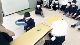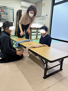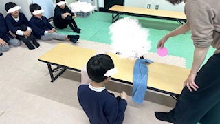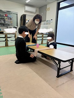 集団活動は「どっちだ(?_?)ゲーム」を行いました。青とピンクの紙を貼った段ボールのコマをスタッフが回し、出た色のタオルを引っ張るゲームです。どちらの色が出るかを判断し、直ぐにタオルを引っ張る瞬発力が必要です。上手く引っ張れるとヤッター!タオルを取れなくても次は取るぞ!と切り替えてみんな笑顔で楽しみましたよ😊