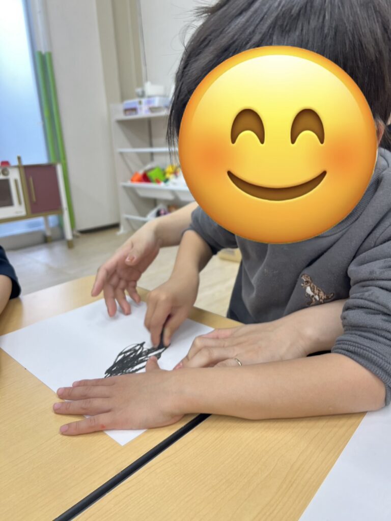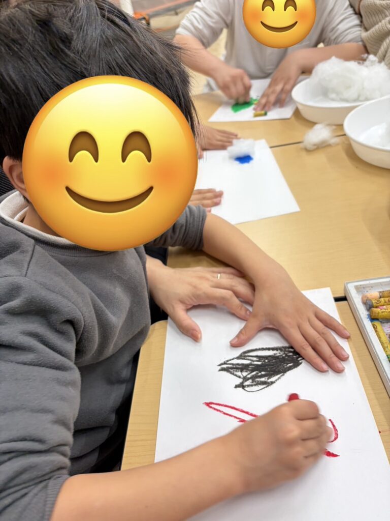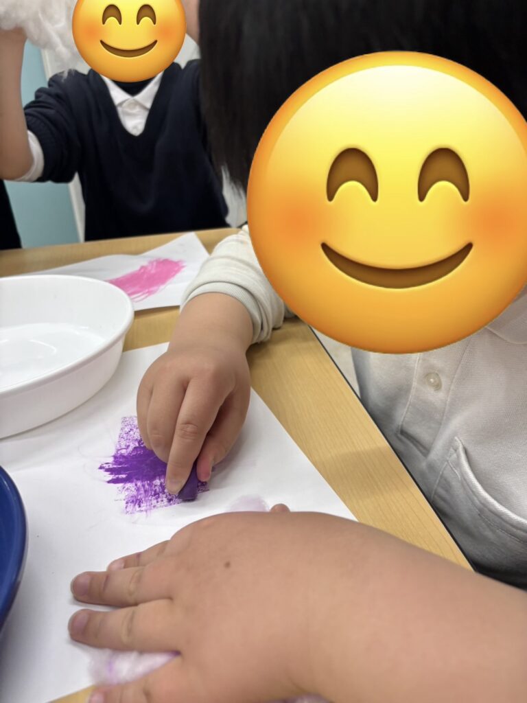 ・クレパスで塗る、綿でこする動作を通して指先や手首の動きを促し、微細運動の発達を促すこと