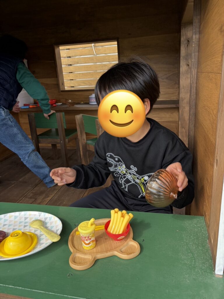 木のお家の中ではお店やさんごっこになり、お料理を作る店員さんとお客さんに分かれて楽しんでいます😊