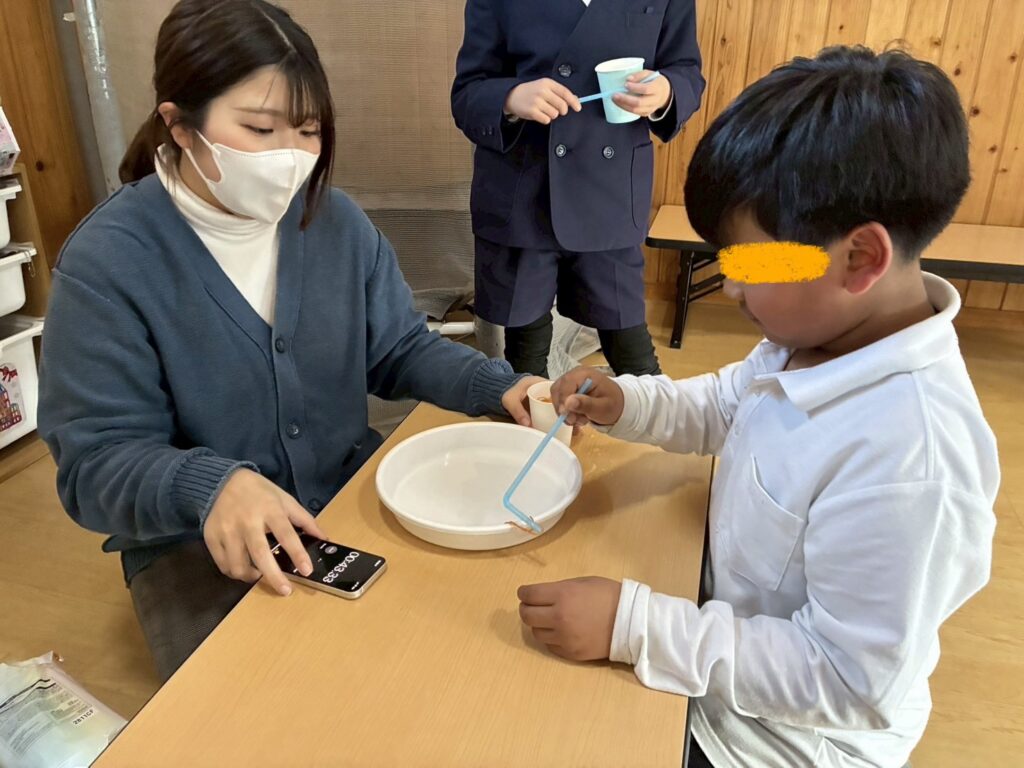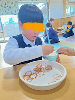 ・輪ゴムすくい…ストローの先で輪ゴムをすくっていきます。手先の細かい運動を集中して行っていましたよ‼