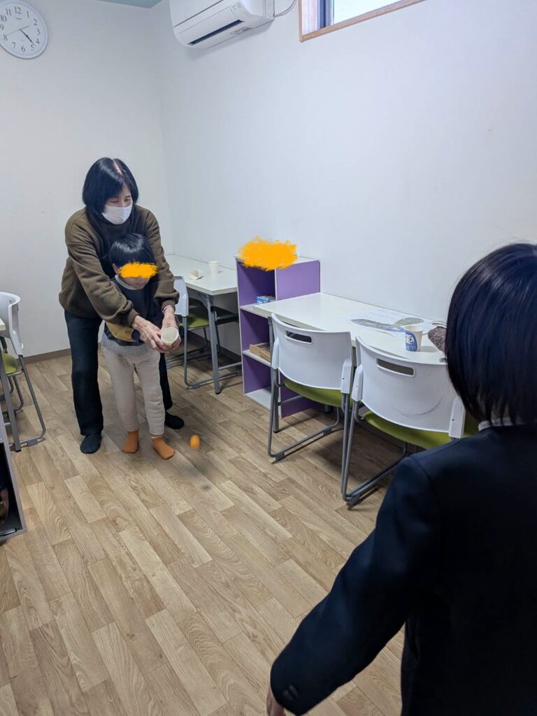 ・紙コップボールキャッチ…相手を見てコントロールしていきます。キャッチするのもボールの動きをよーく見て動きました。