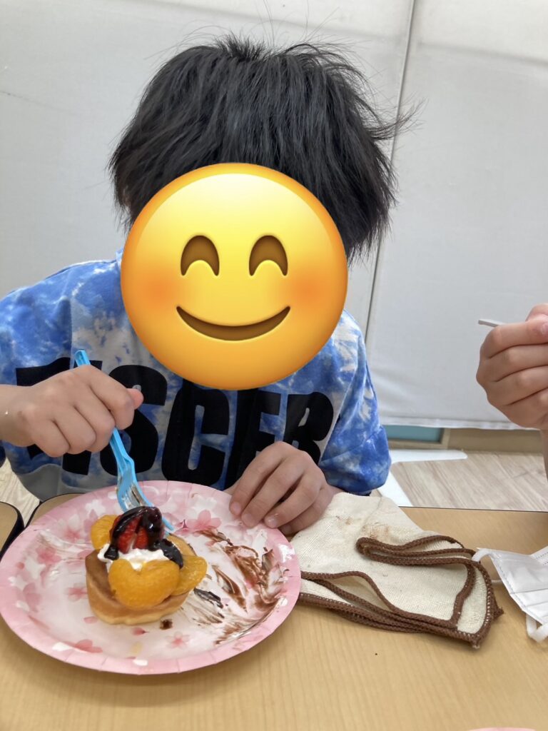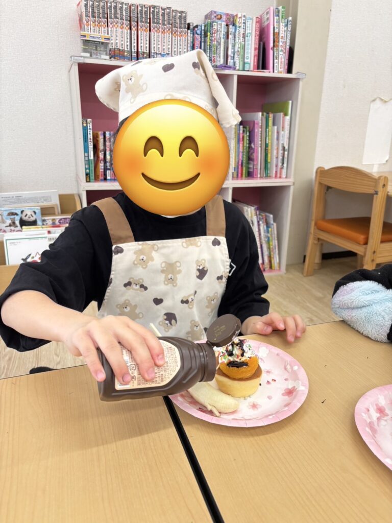 「チョコソースをたくさんかけるぞ!」と好きなものを見つけて、たくさんトッピングしていました✨