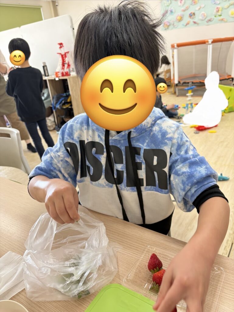 包丁を使うので、怪我をしないように手を置く位置を確認しながら、また形が凸凹しているので、慎重に、いちごを切ってくれました!