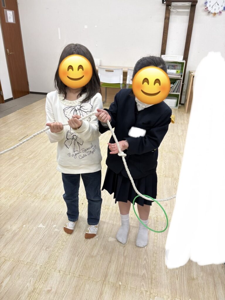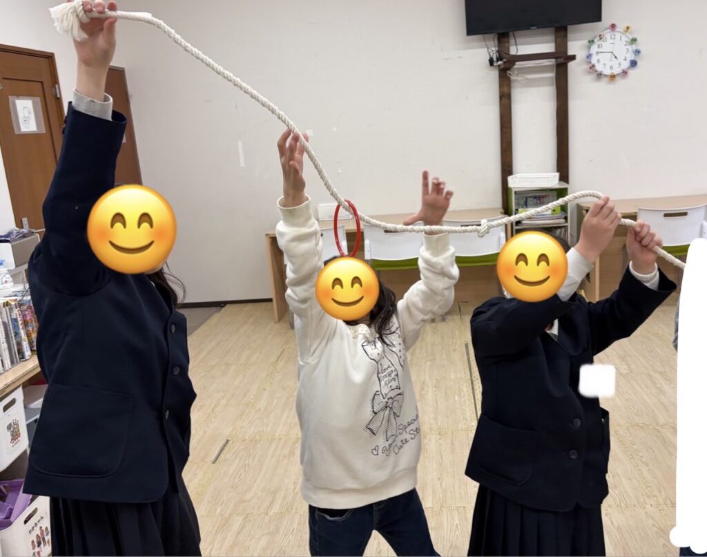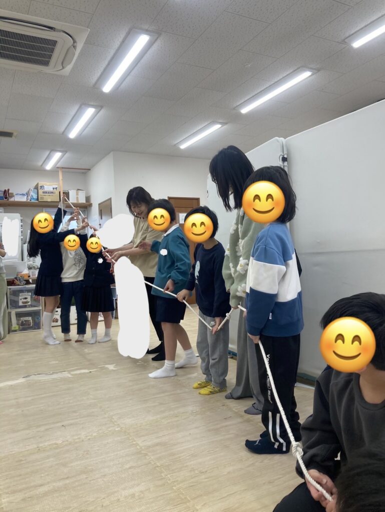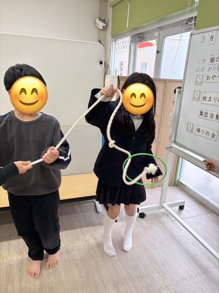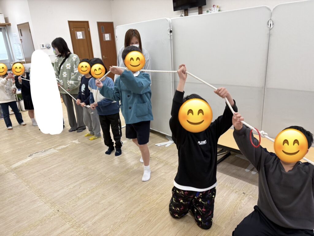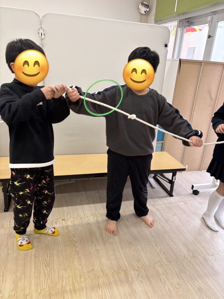 この活動は、子どもたちとスタッフが横一列に並び、長いロープをみんなで持って行います。ロープの端から輪っかを通し、手に当たらないようにしながら、隣の人へ順番に渡していき、最後まで運ぶことができたら成功です☆