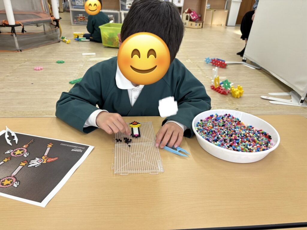 ⚪︎アイロンビーズでかっこいい剣やダンボールで釣り竿や迷路作りです。迷路ができるとビー玉を転がして遊びます😊