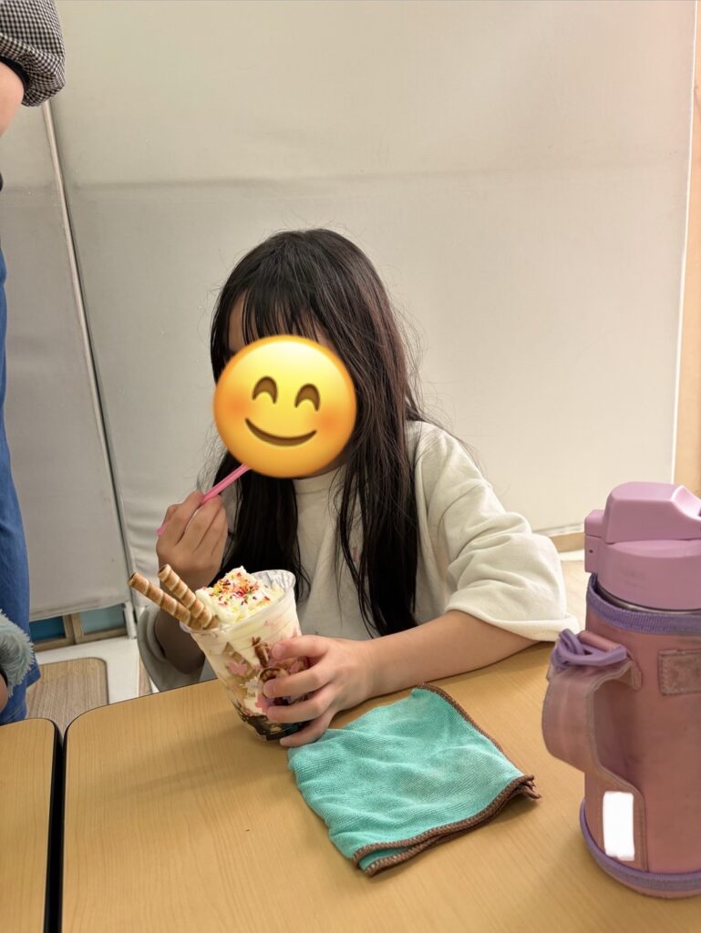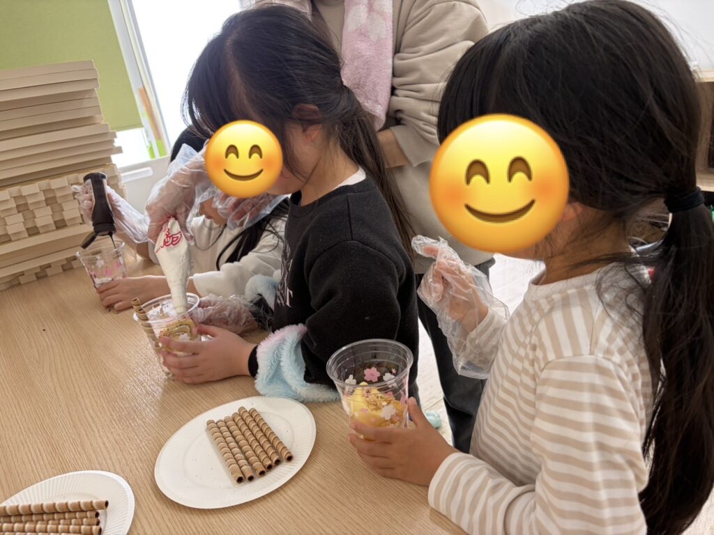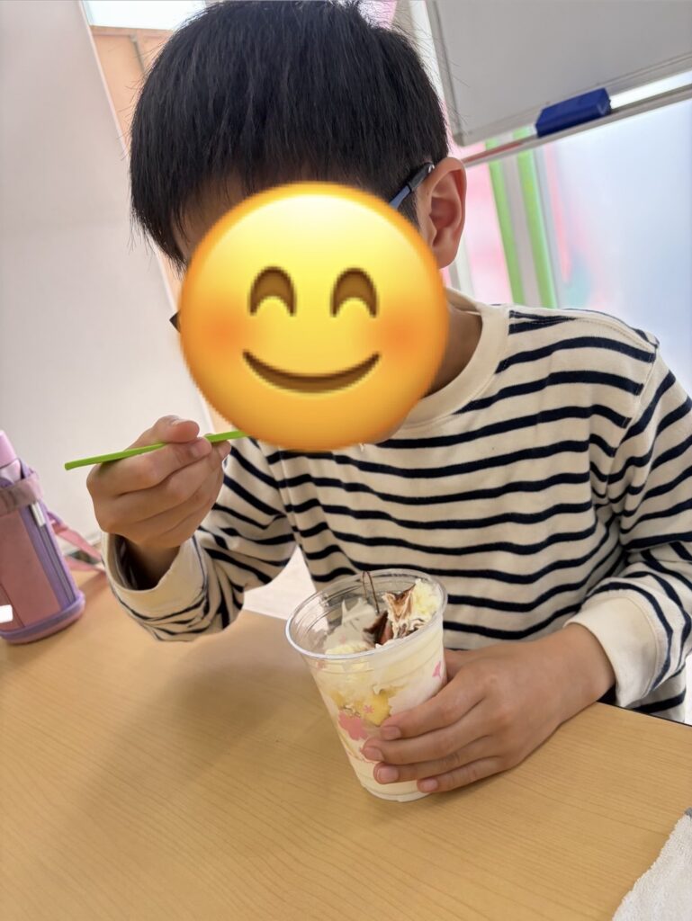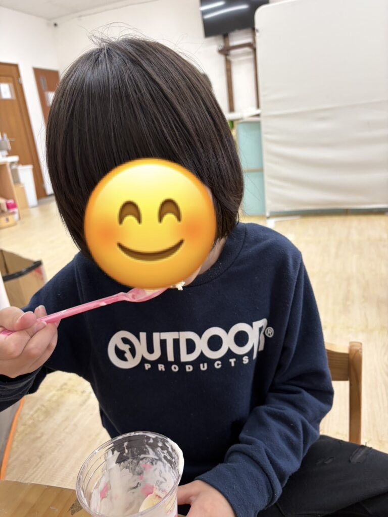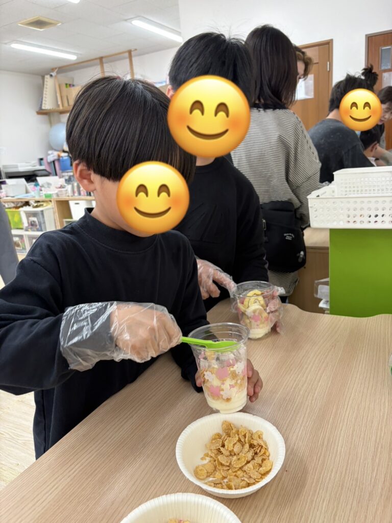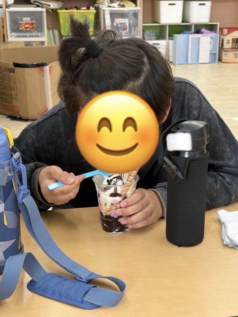 出来上がったパフェを美味しそうに頬張る子達🥰バニラアイスを追加したり、コーンフレークや生クリームを追加したり、「おいしい~!!」と言いながら、みんな完食していましたよ😊❤️