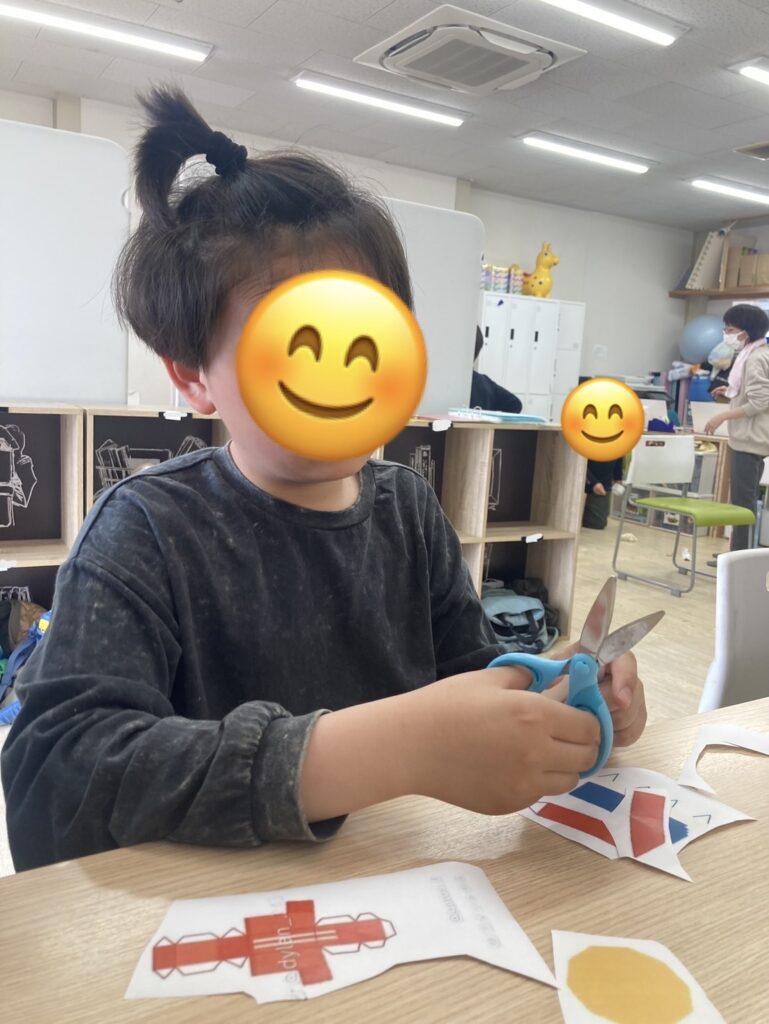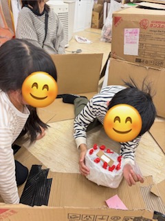 新しいジョイントマットが届き、大きな段ボールがたくさんあるため、それを使って工作に励んでいましたよ♬友達と入れる大きな家を作っていました😊