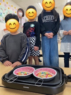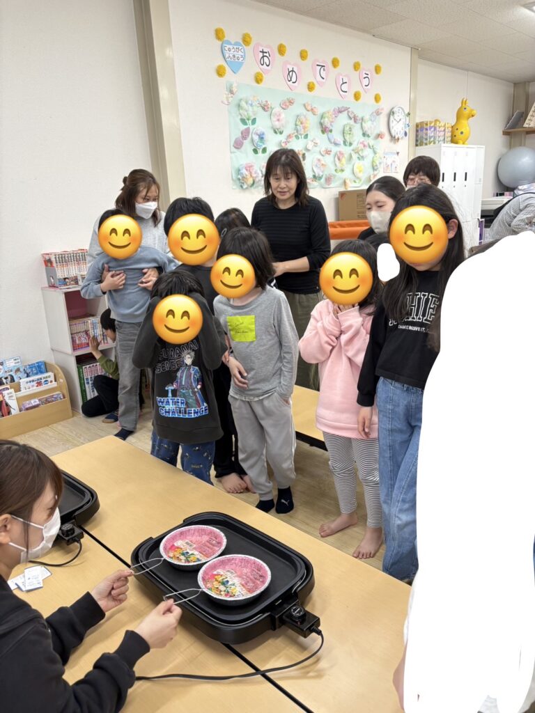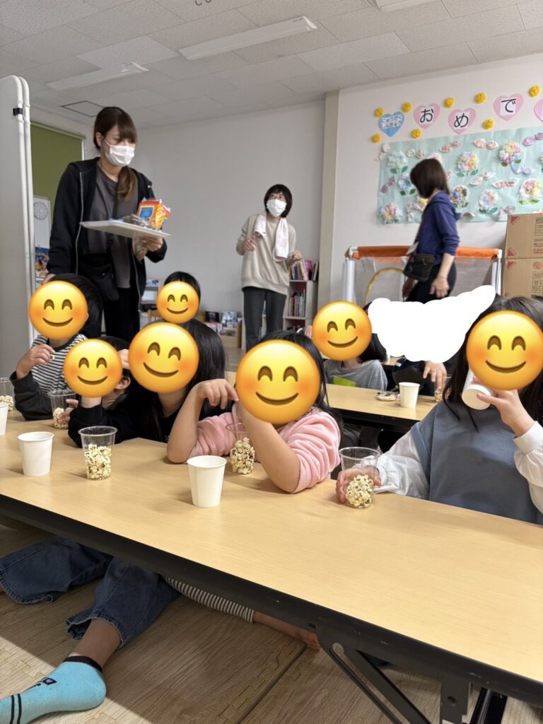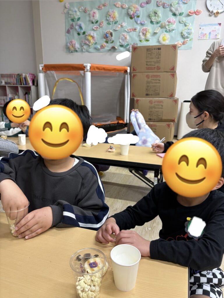ポップコーン作りでは、「まだかな?まだかな?」とワクワクしながら待つ子どもたち😊 ポンポンと弾け始めると、「音がする!」「すごい!弾けた!」とみんな集まってきて、嬉しそうに見ていました✨