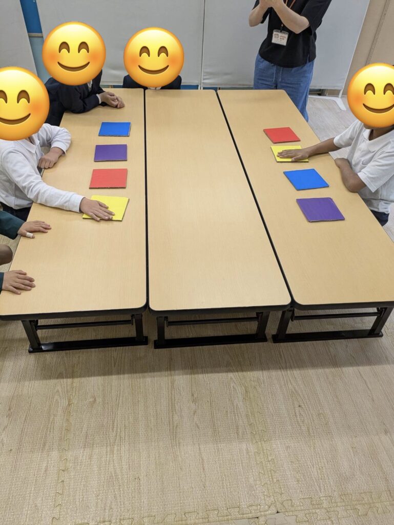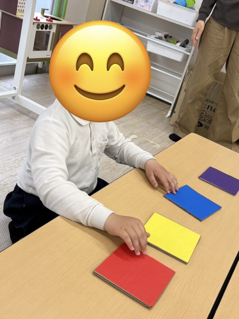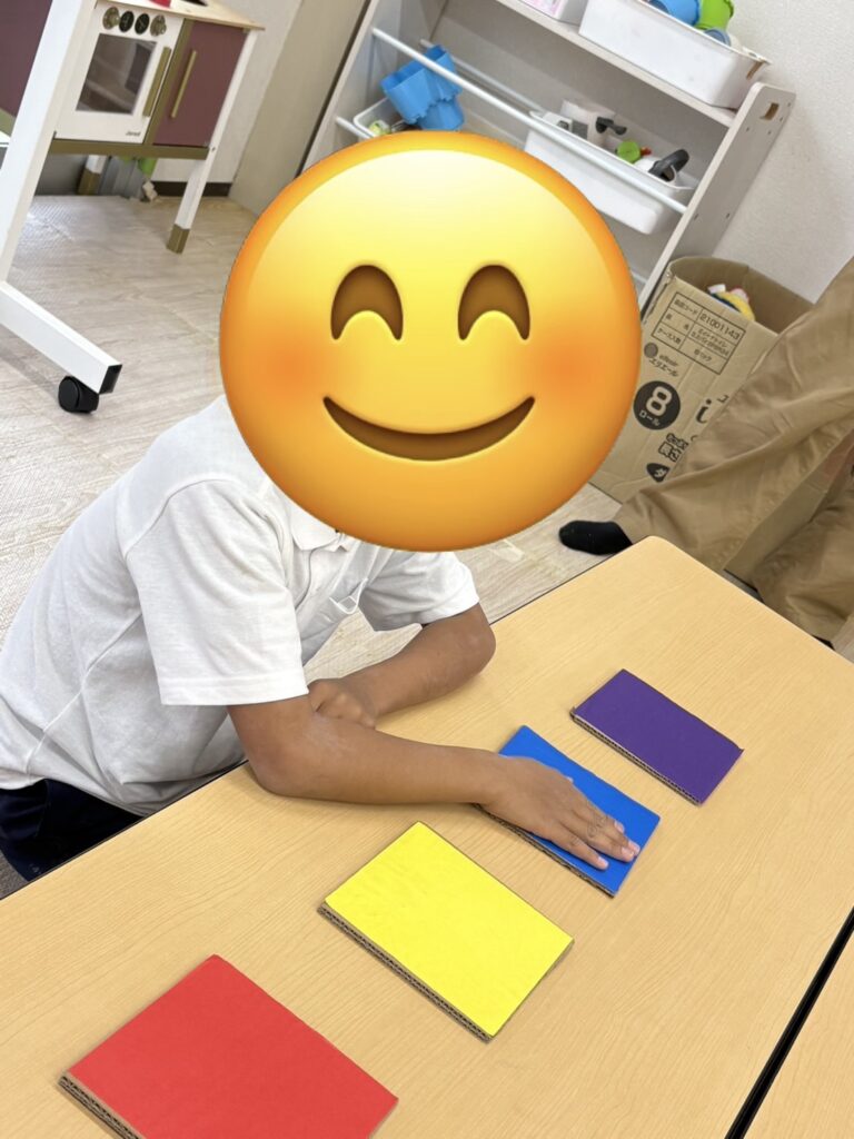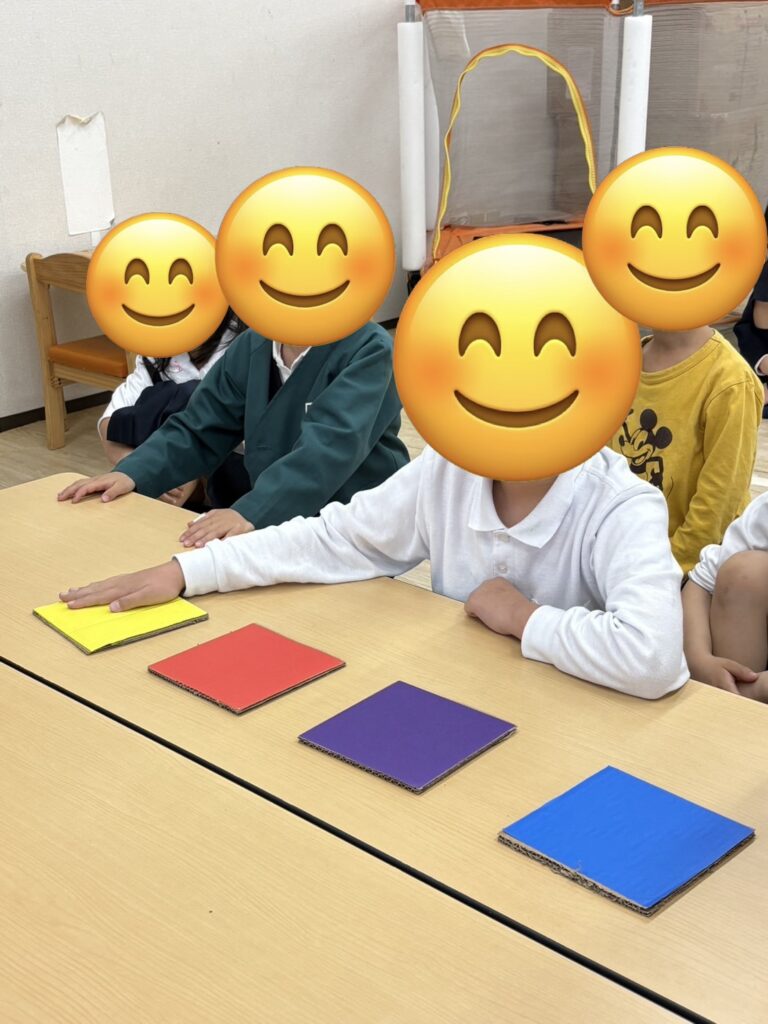 カラータッチゲームでは、4色の色紙を並べます。まずはスタッフの言った色【に】手を置きます。これはみんなバッチリできていましたよ😊次は少し難しくなりますがスタッフが言った色【以外】に手を置いてねというルールに変えました。するとあれ?となるお友達もいましたが間違えても怒ったり泣いたりもせず気を取り直して続けることができました💕
