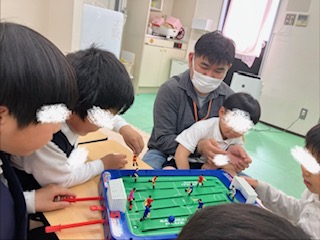 力加減が難しい子も、ボールを慎重に動かす様子が見られました☺️また、勝敗がはっきりついてしまうゲームなので、悔しい思いをする場面もありますが、高学年の子が中心にお話をしながら手加減をしたり、負けた子にも「チャンスタイム!!」と救済措置を与える場面も見られました😆