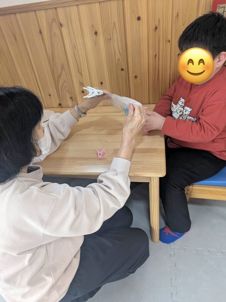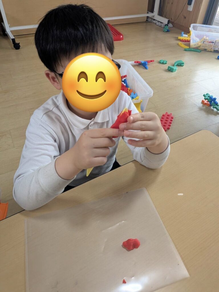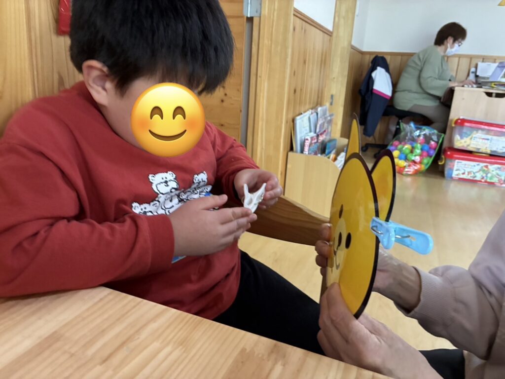 指先の運動を目的としています。可愛い動物の顔周りに、頑張って付けてくれました!!投げ出さずやってくれて、笑顔も見えて嬉しかったです🥰