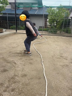 ジャンプが得意な子も苦手な子も全員が一緒に跳べるように、はじめは置いてある縄を踏まない様にジャンプする。次は横なみなみを跳んで縦なみなみ。ゆらゆら揺れ出した縄もジャーンプ!!最後はみんなで一緒に合わせて跳びました。