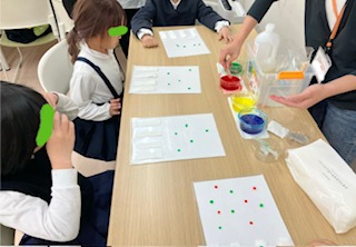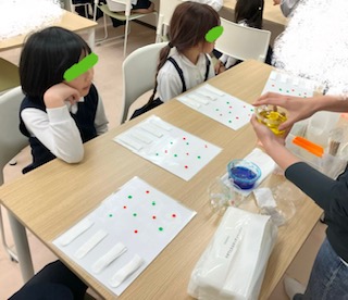 赤、青、黄色、緑の色水をクリアファイルの上へスポイトで絞り、「混ぜたらどうなる?」や、クリアファイルの上で色水を動かしてみたり・・・