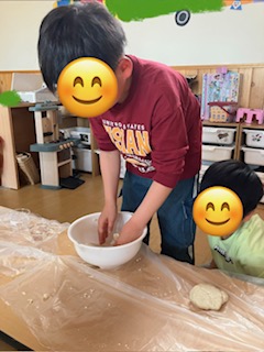 ちょうどよい感じにかたまった粘土でカップに入れて遊んだり、パンやハンバーガー、お餅などを作っている子もいて、想像力豊かな子どもたちで見立て遊びがとても上手にできていました❀