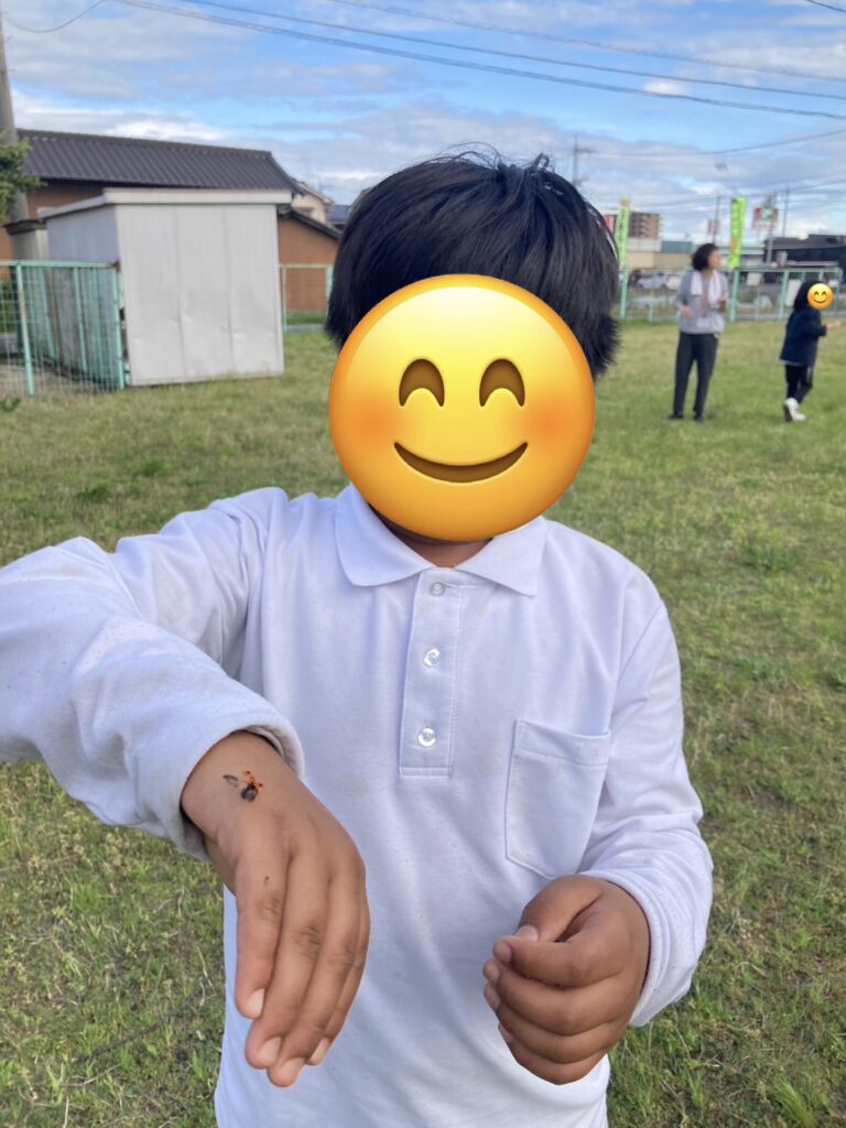 遊んでいる途中でテントウ虫を見つけた子は、手に乗せて見せてくれましたよ!