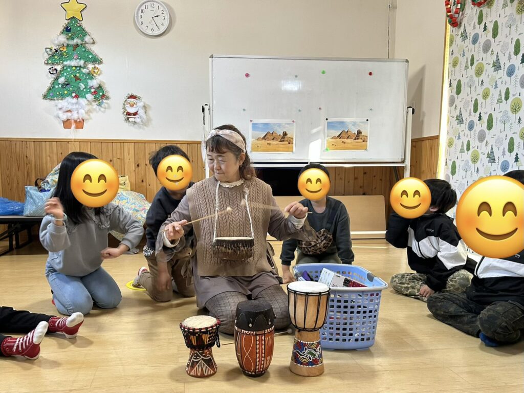 世界のお話や地図に触れたあとに世界の打楽器に触れています💖